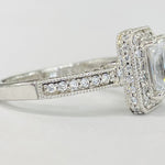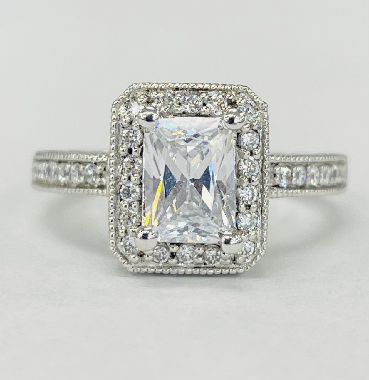 A vintage inspired setting with alot of diamonds. Featuring a pave set halo with millgrain and diamonds. Accented by a vintage inspired shank with even more diamonds and millgrain.
