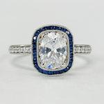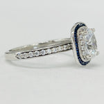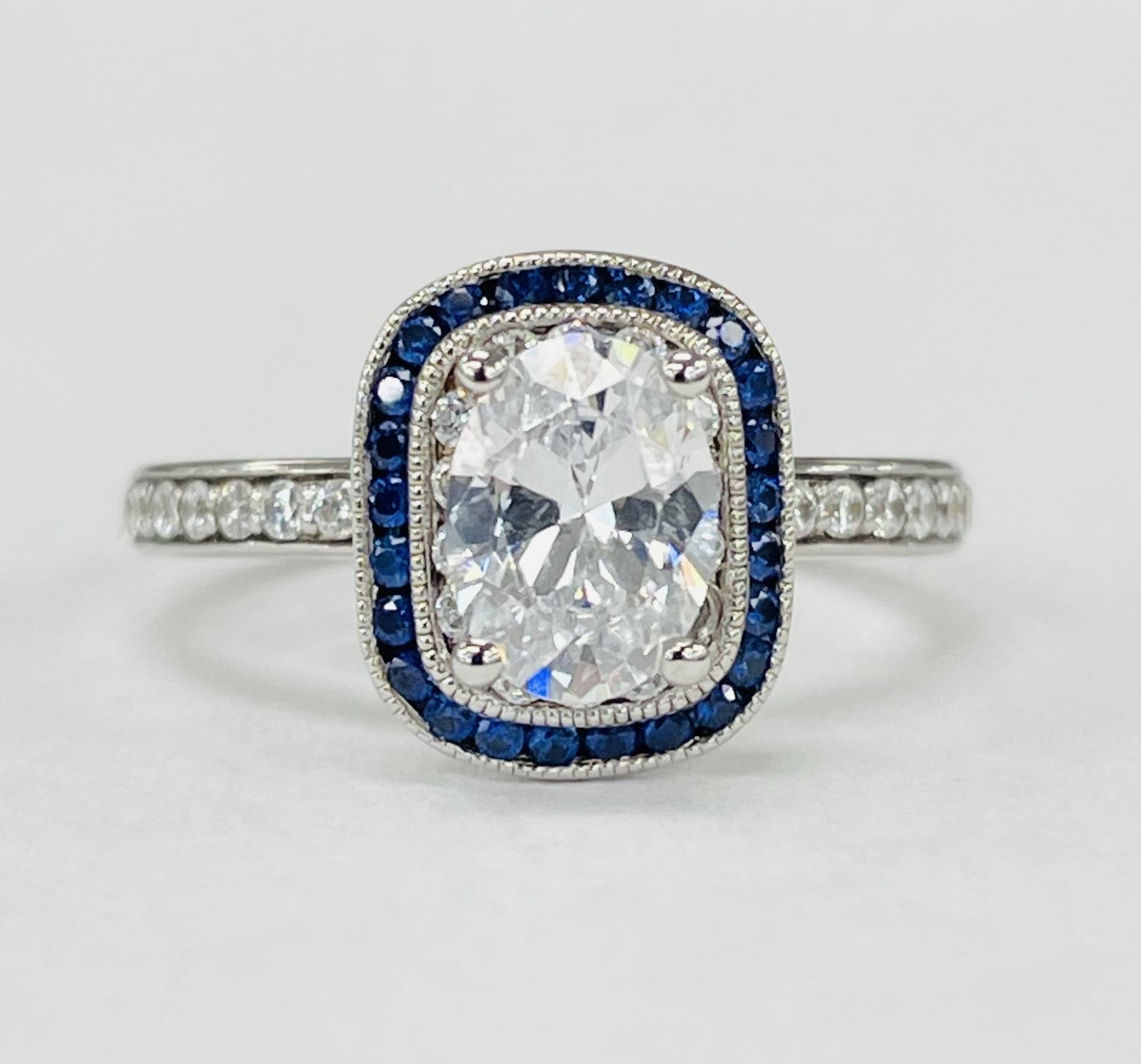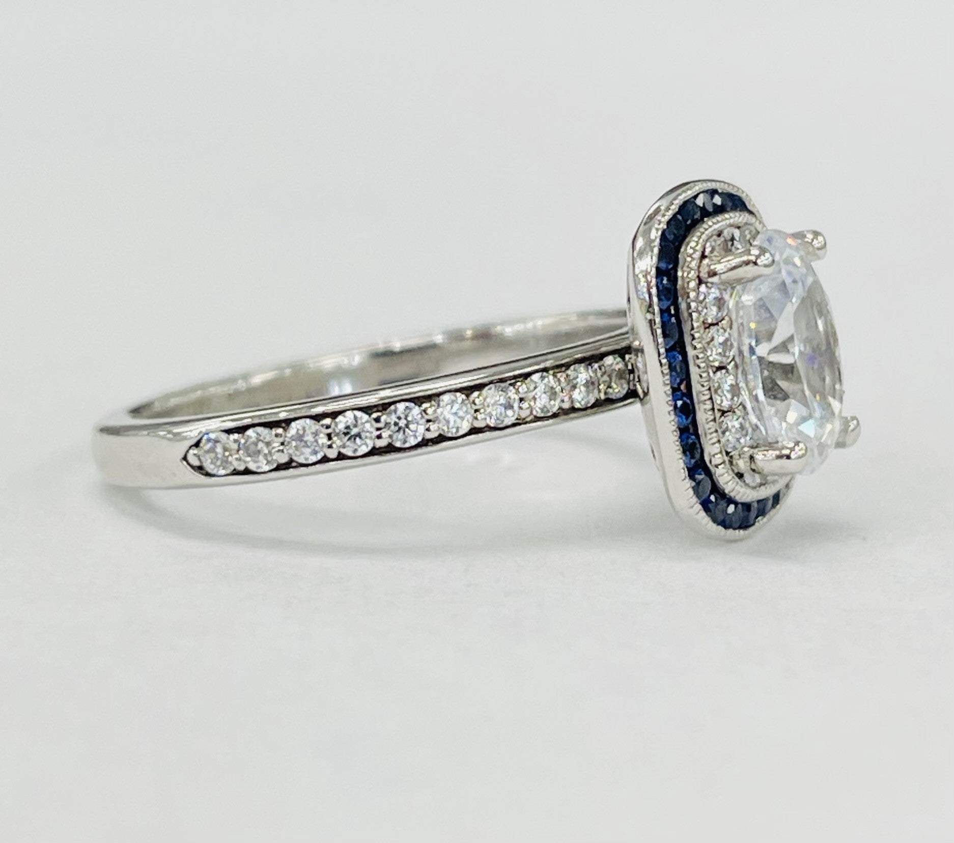 A vintage feel with a splace of color. This ring features a smooth halo with sapphires and millgrain to accent the center stone. With diamonds channel set down the sides as well for even more sparkle to accent your main stone.