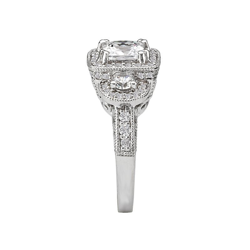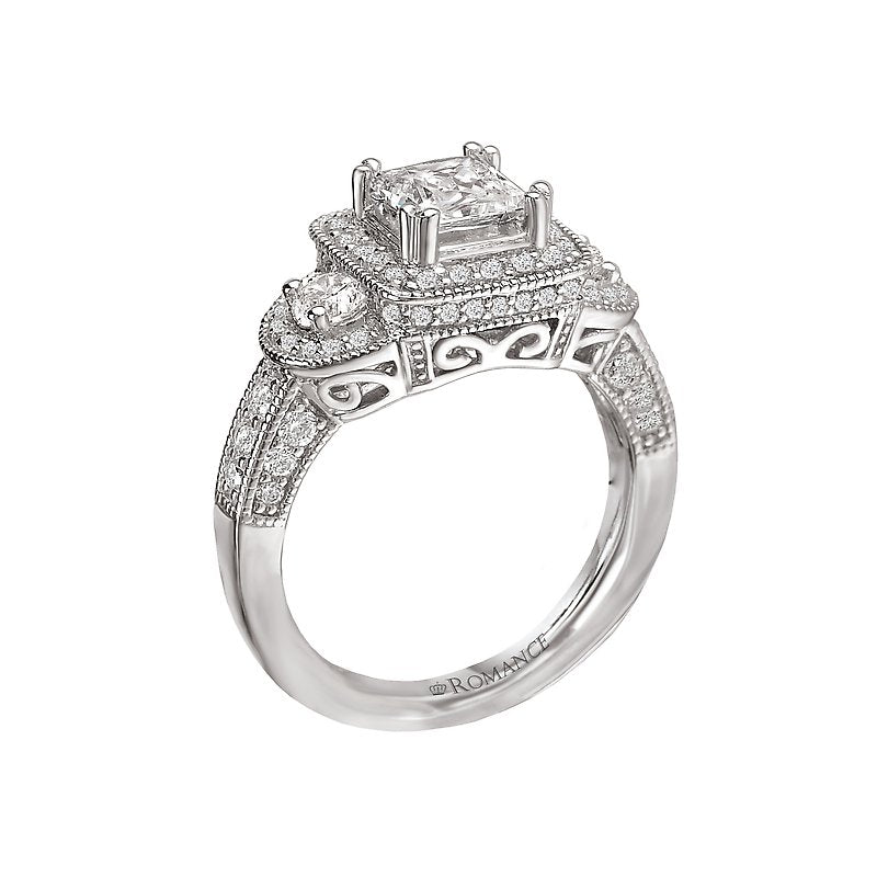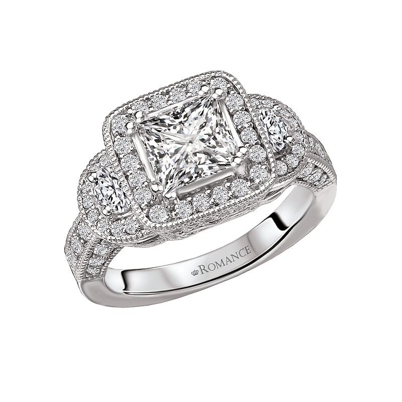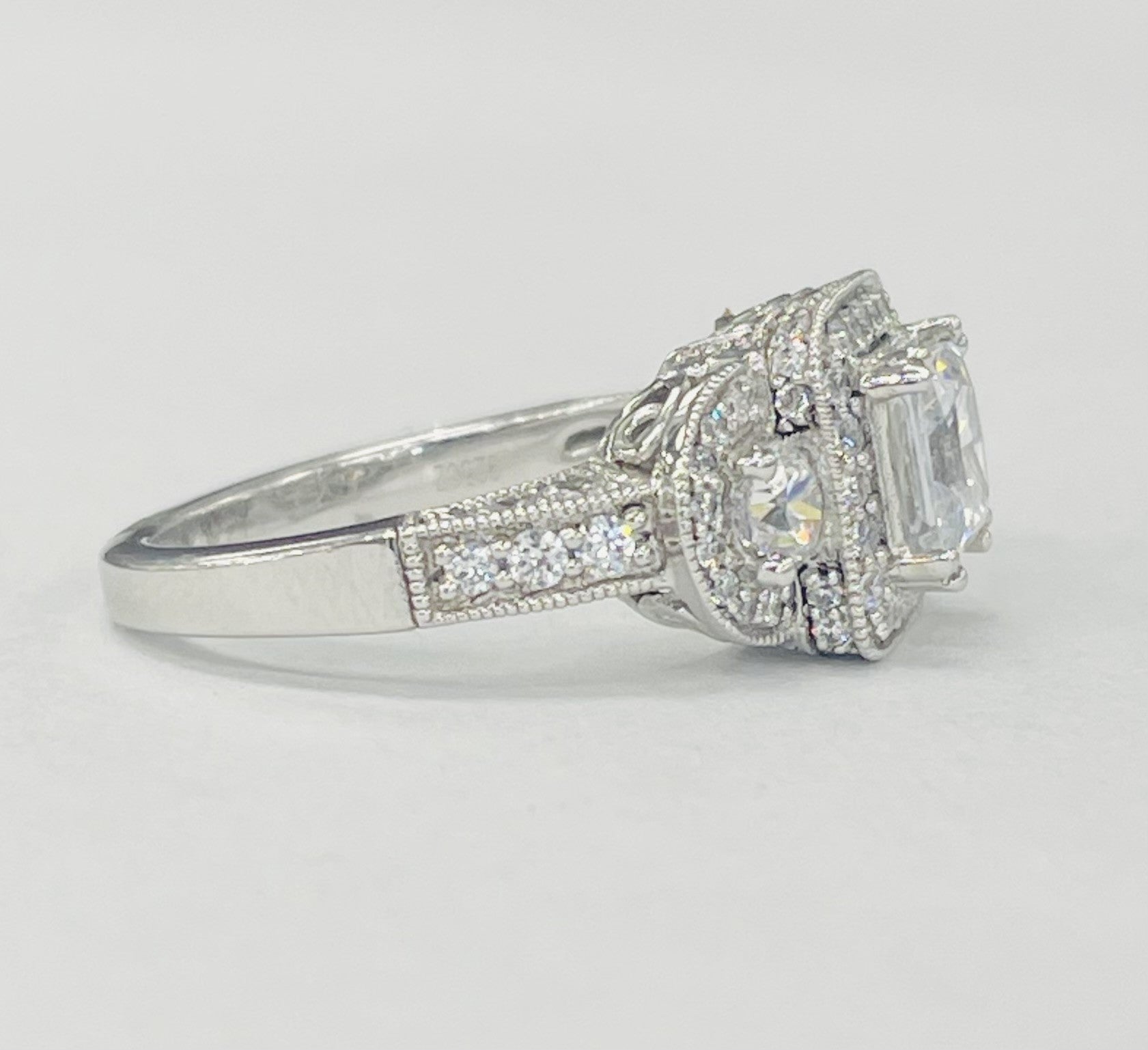Romance - Vintage Inspired Three Stone Halo Pave Diamond Setting