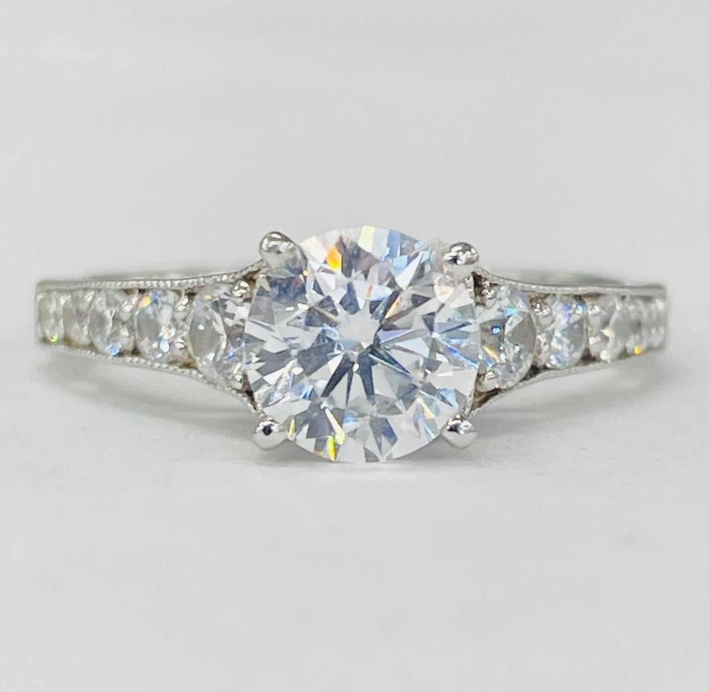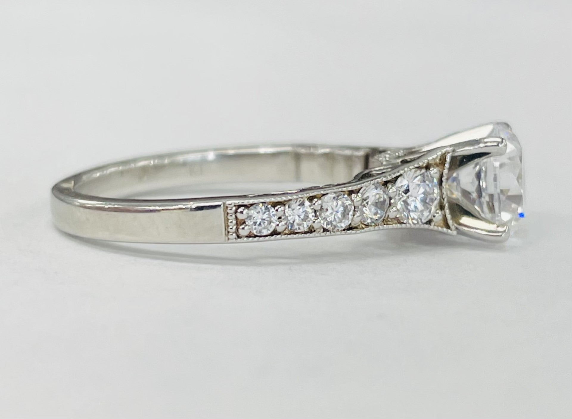 A beautiful white gold simple setting. Featuring a graduated diamond cathedral style setting with millgrain. Accented by a beautiful open fillagree undercarriage.