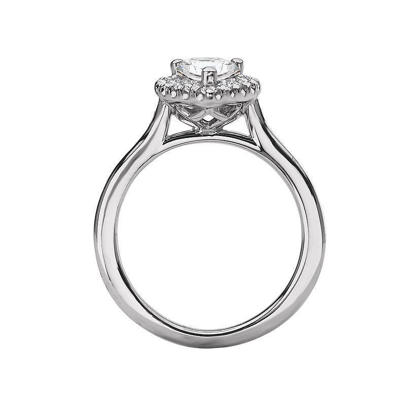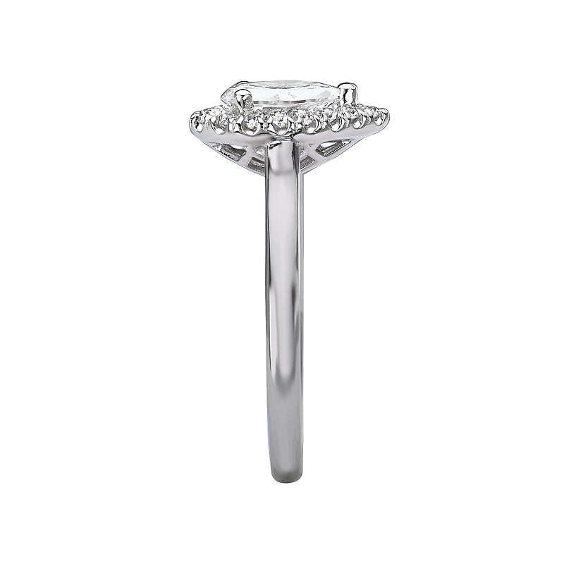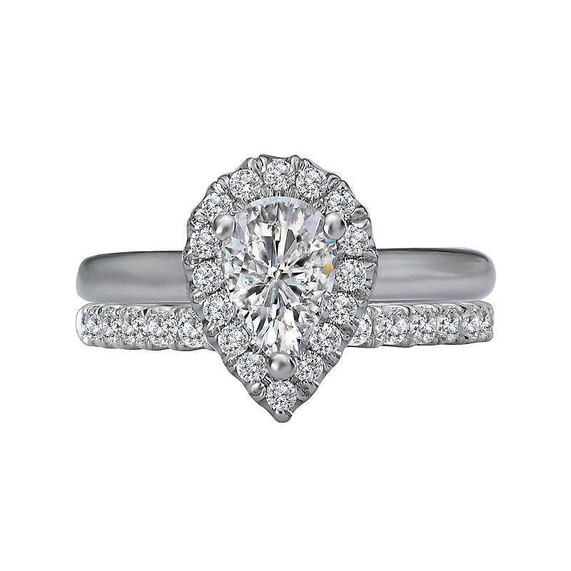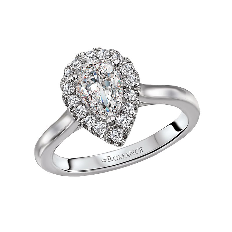 This is a beautiful semi-mount engagement ring is crafted in high polished white gold with a diamond halo surrounding a center setting that accommodates a pear shaped diamond.