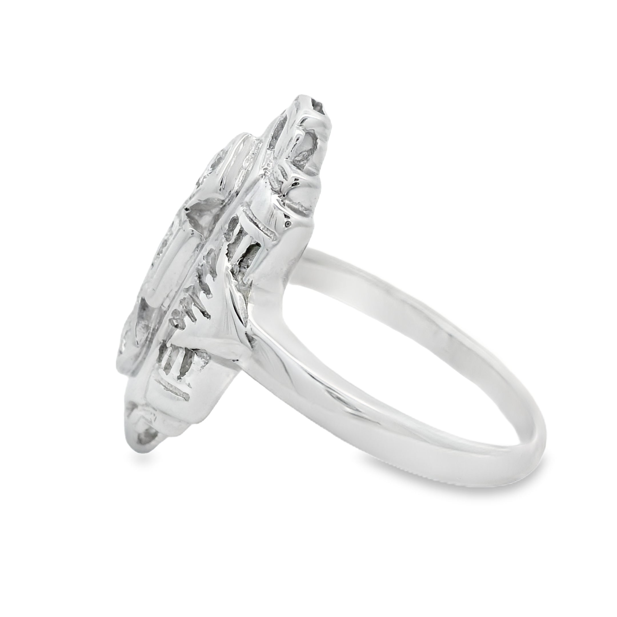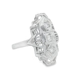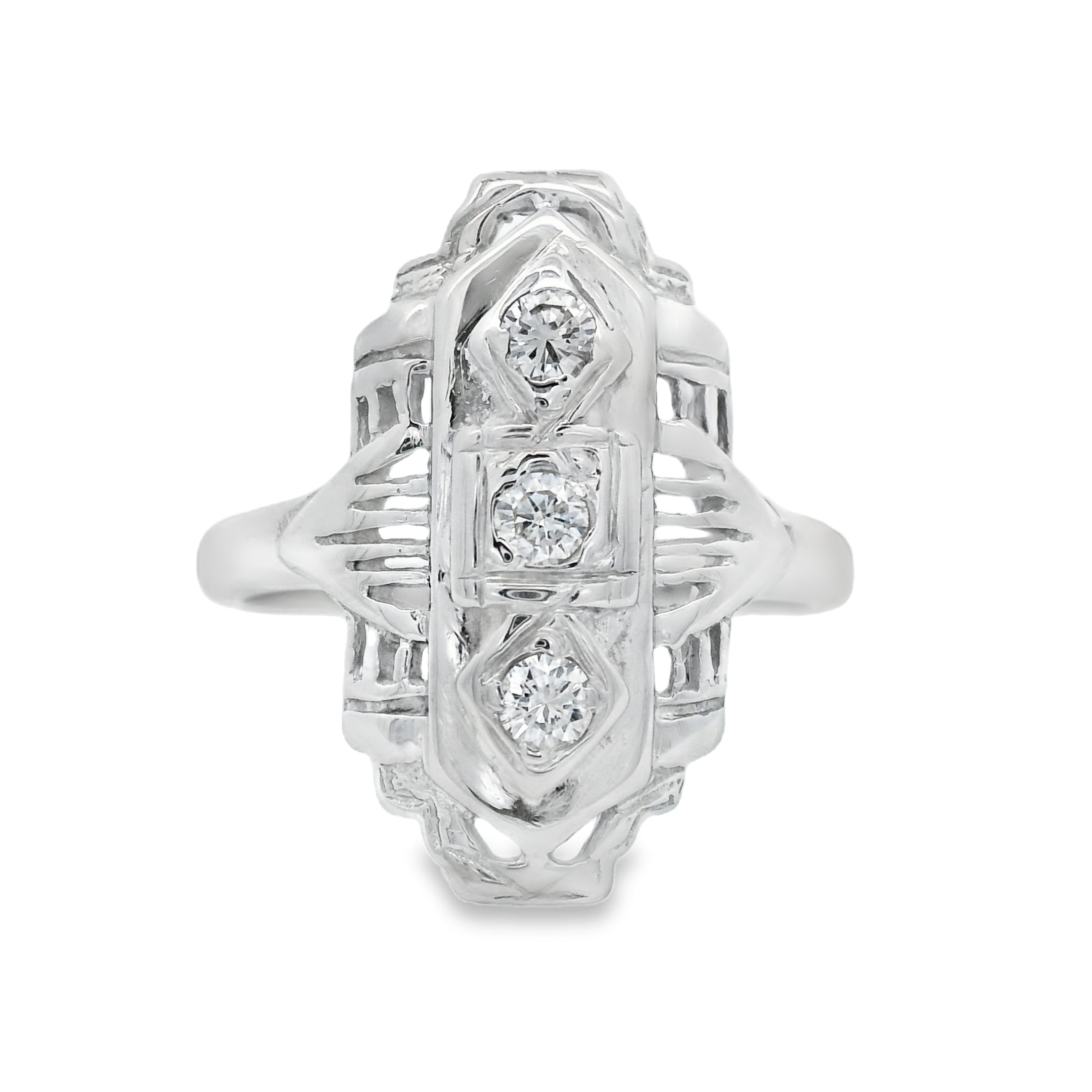 This simple and elegant ring features three diamonds vertically with vintage etching all around. Made out of white gold this ring is perfect for the vintage lover in your life