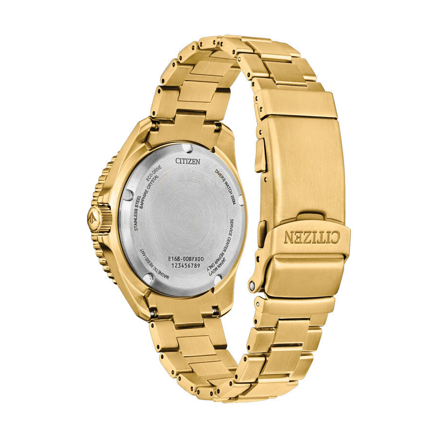 Good looks meet dive-ready functionality in the latest Promaster Dive timepiece. Comfortable on the wrist at 41mm in gold-tone stainless steel, this handsome tool watch is secured to the wrist via a matching triple-link bracelet and stylized in wear via a green unidirectional bezel. The gradient green dial hosts the highly visible applied hour markers, with plenty of lume and a unique handset easily showcases the time no matter the lighting conditions. A subtle date window at the 3 o'clock position provides daily utility. Featuring our Eco-Drive technology – sustainably powered by light, any light. Never needs a battery. This high-performance watch includes a wetsuit extender that doubles as a tool-less microadjust, is ISO compliant and water resistant up to 200 meters, and comes in an exclusive dive tank box. Caliber number E168.