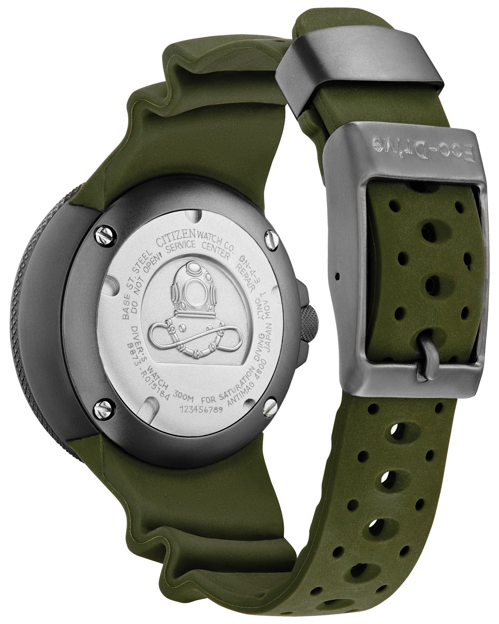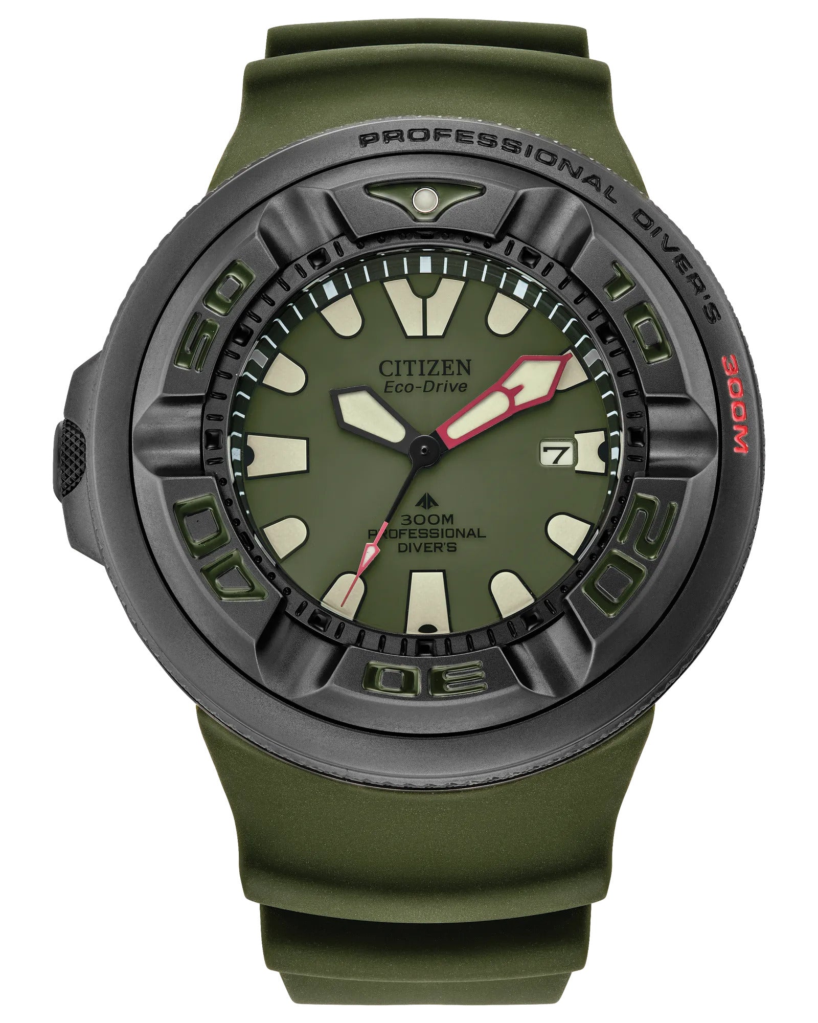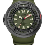 Explore the deepest depths with Citizen’s newest Promaster Dive with water resistance up to 300 meters. This iconic men’s high-performance dive watch features a black stainless steel case, a green 3-hand dial with luminous hands and markers for superior legibility, and a durable, green polyurethane strap for lightweight comfort. Sustainably powered by light with Eco-Drive technology and never needs a battery. Caliber number B873.