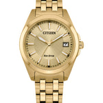 A refined take to a classic style. Featuring a gold-tone stainless steel case with a champagne 3-hand dial and date function, the newest addition to the Classic collection is understated and stylish. This Classic watch includes a gold-tone stainless steel bracelet with a fold-over clasp and is Sustainably powered by light with Eco-Drive technology, this watch never needs a battery and offers a sleek look and upscale feel.