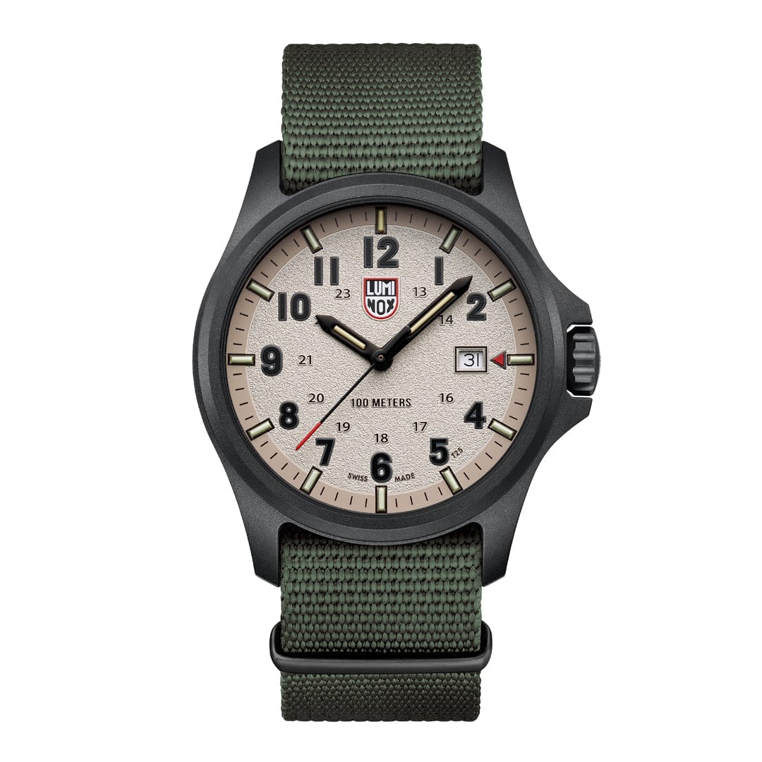 This Atacama Field 1960 watch is inspired by its namesake, the Atacama Desert. The design with a warm grey dial with a textured finish and black numerals evokes the terrain and rugged landscape of the desert. The timepiece presents a large dial that displays the 12- & 24-hour clock, a red-tipped second hand, and a red arrow next to the date at 3 o’clock for instant readability. The dial is protected by a sapphire crystal with an anti-reflective coating. The 43 mm CARBONOX™ case is matched with a black rubber strap that can also be swapped with the additional second strap that comes with the watch, a dark green webbing NATO strap.