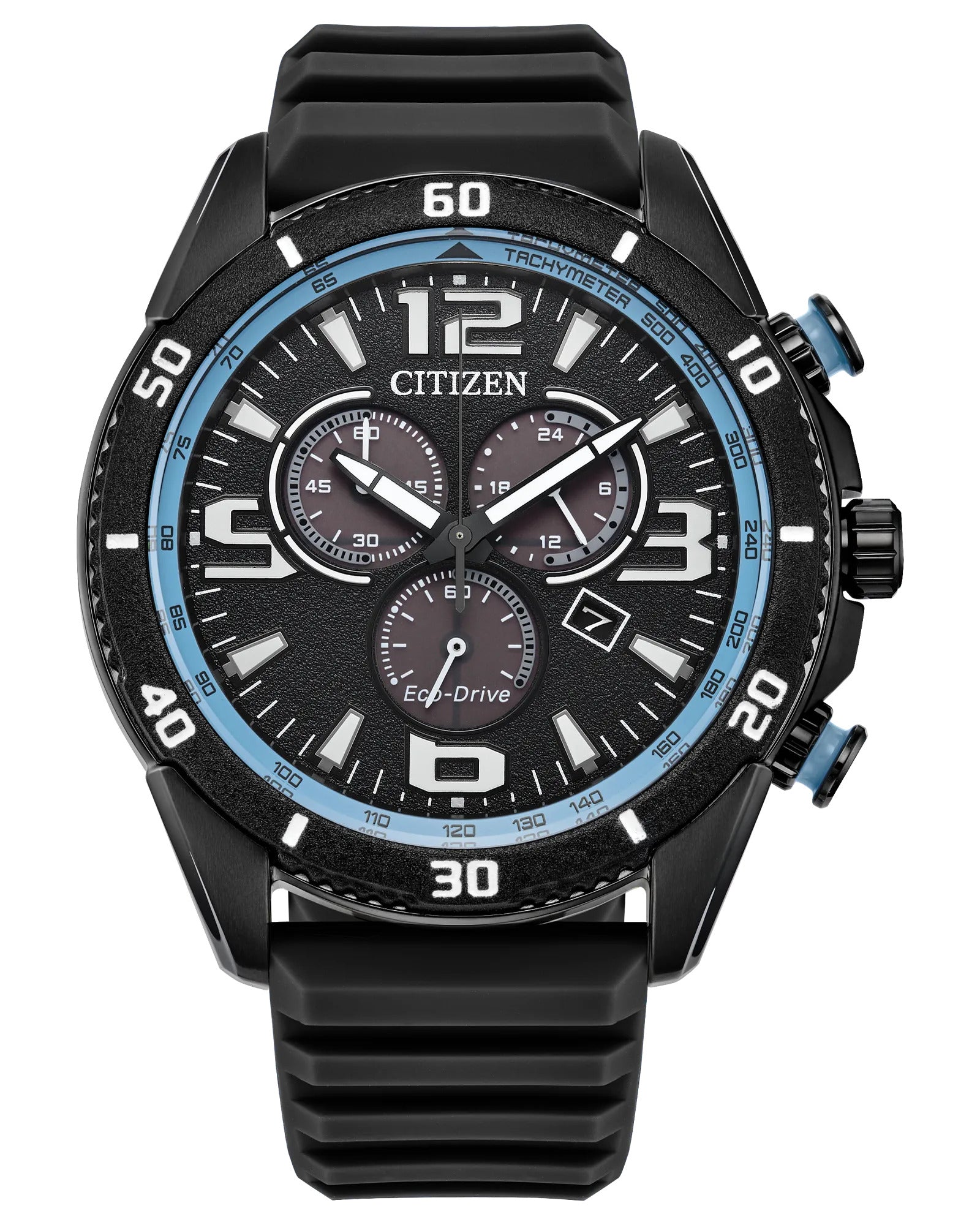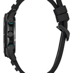 Bold and sporty, this new Brycen chronograph from Citizen is ready for any adventure. The watch wears boldly at 44.8mm, with a black-tone stainless steel case accented with blue details on its racing-style pushers. A rotating 60-minute bezel adds to its functionality, while a durable black silicone strap secures the timepiece to the wrist.