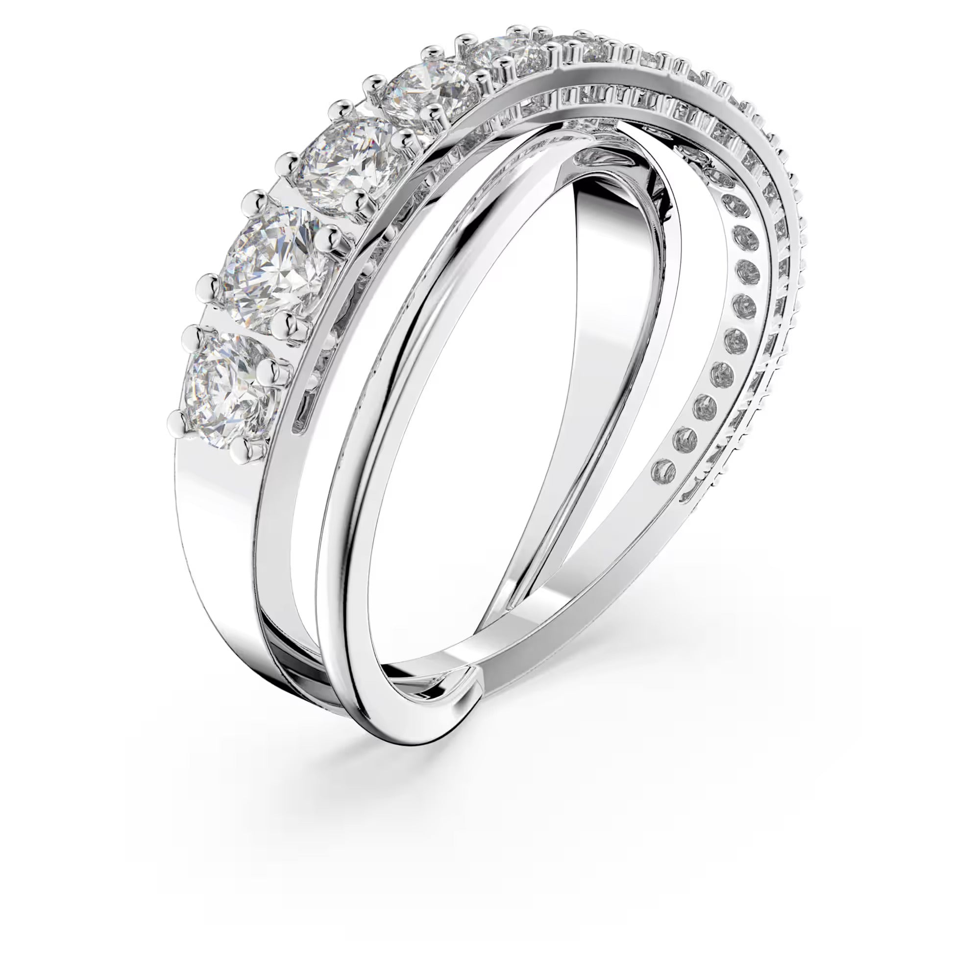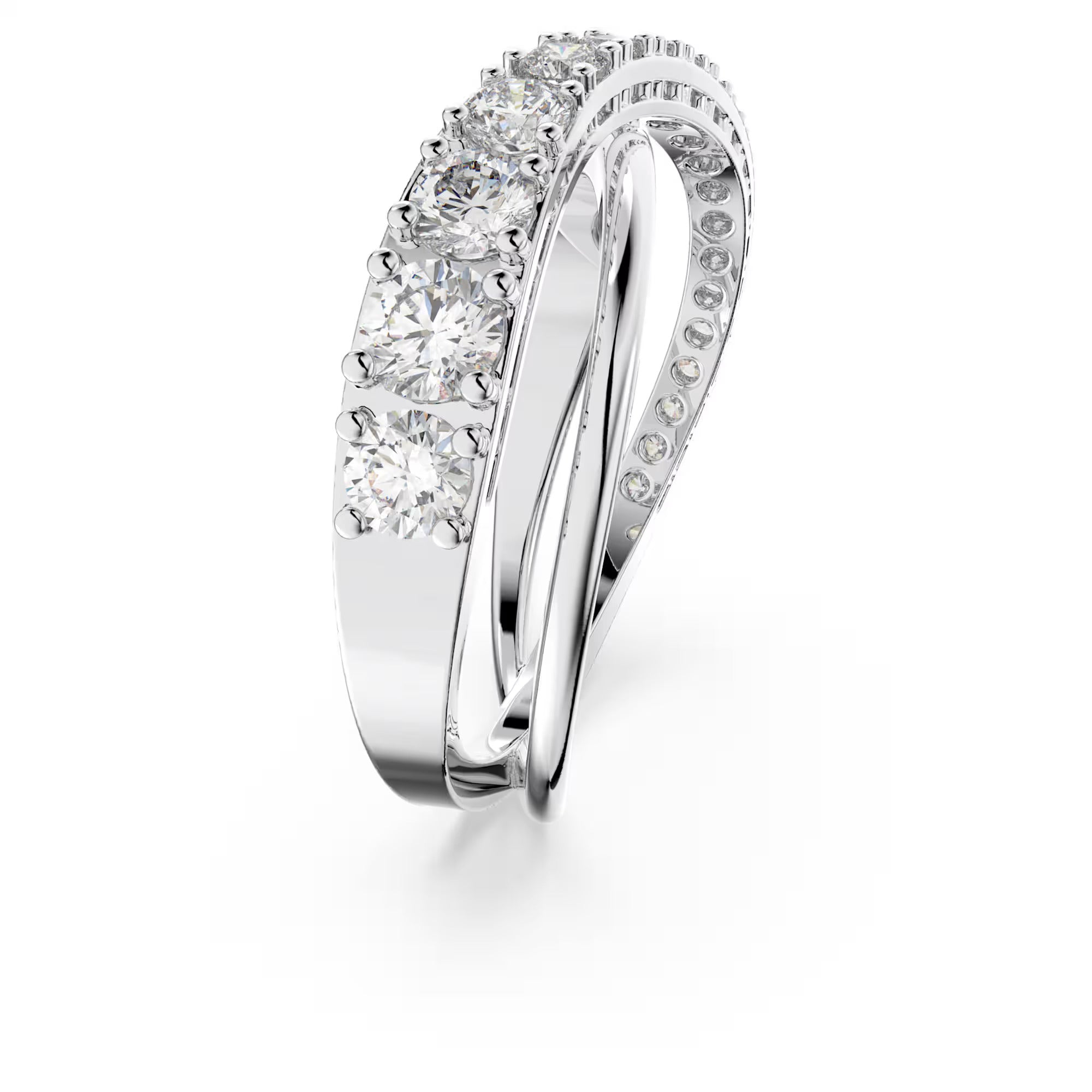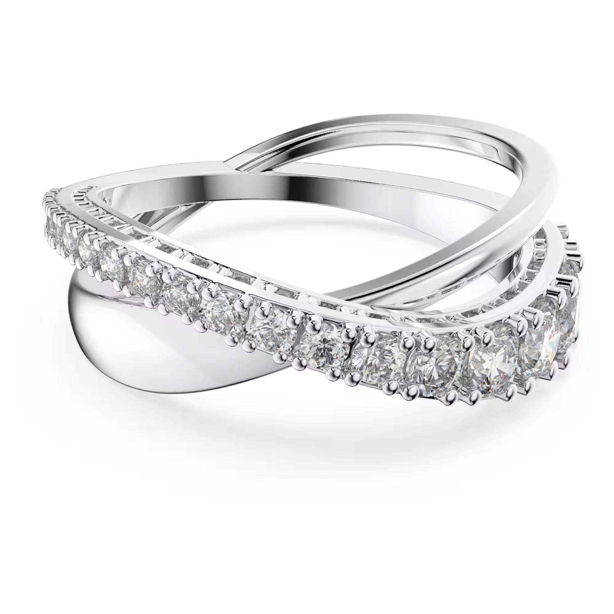 Timeless yet stylish, puristic yet brilliant. This ring by Swarovski displays an inspired take on the spiral trend. Two shimmering lines intertwine in elegant, gentle curves, one crested with marvelously glittering white stones that add sparkling radiance to the ring. Its simplistic design makes it perfect for everyday wear, complementing your style with a touch of brilliance.