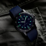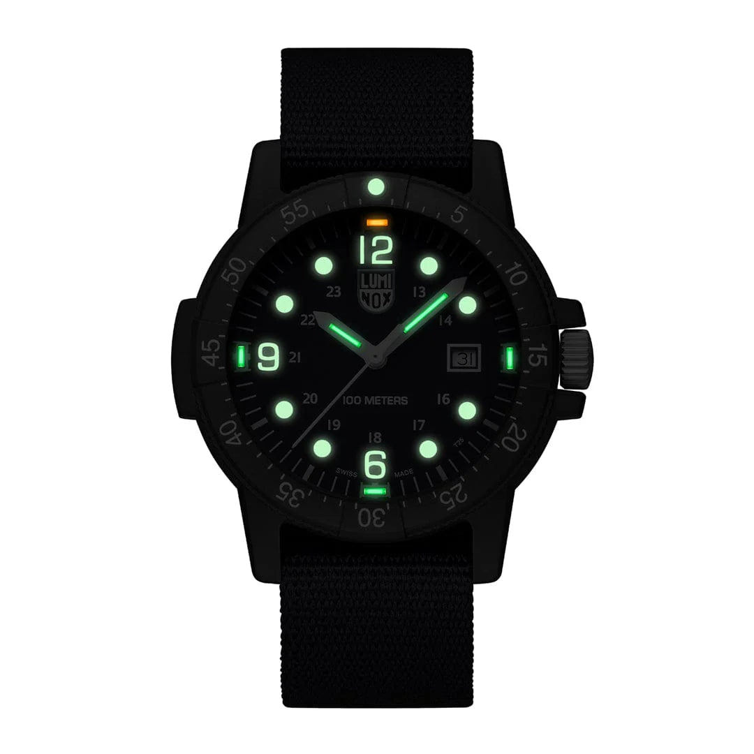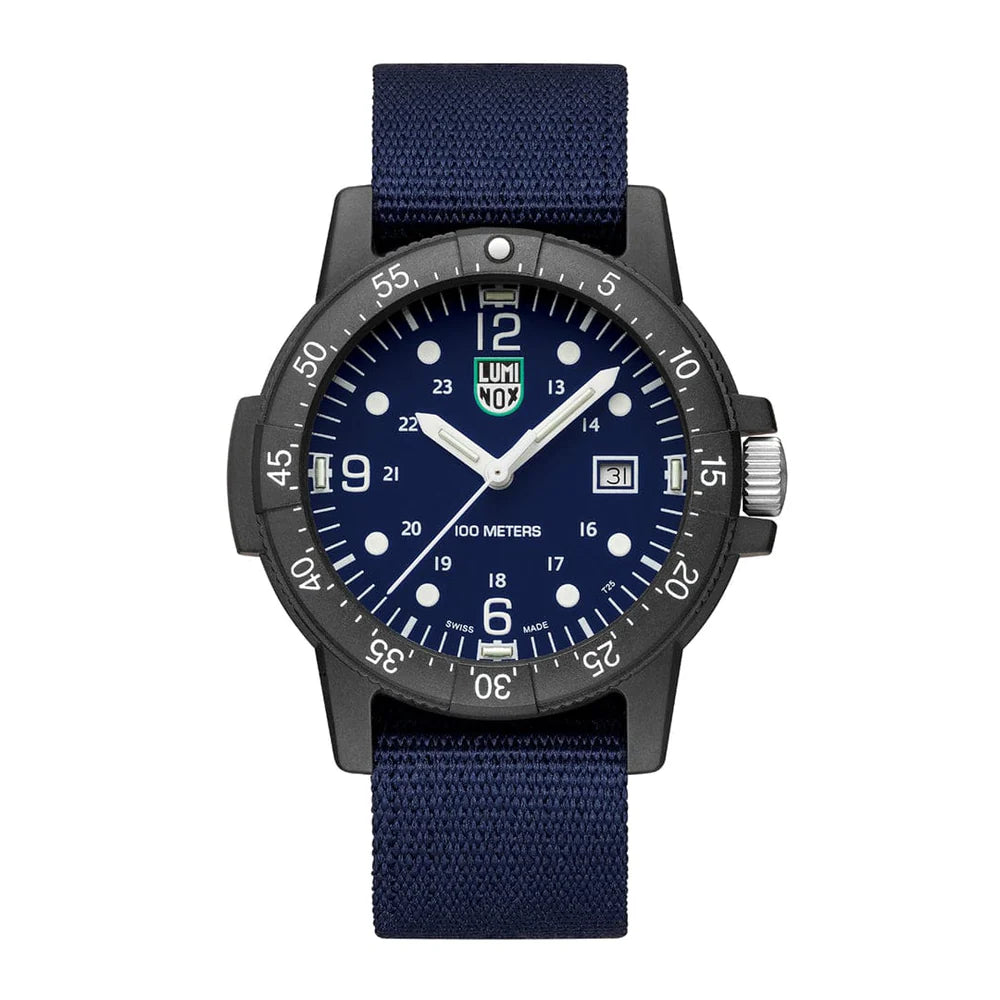 The Sea Bass features an impressive 44mm CARBONOX™ case and water resistance up to 100 meters. Its Navy blue dial with white numbers provides maximum readability during the day. This watch comes equipped with a Navy blue R-PET belt strap adorned with stainless steel signature buckle. At night, the proven Luminox Light Technology lighting system assumes this function. "Always Visible", self-powered, for up to 25 years.