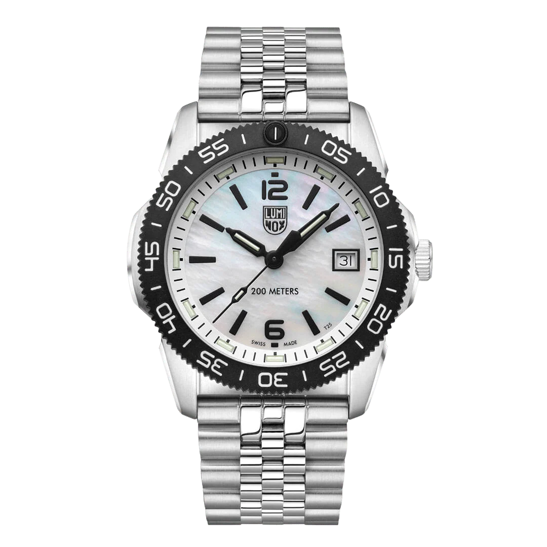 The Pacific Diver Ripple collection takes its design from the popular Pacific Diver, launched in 2020. The Ripple is available in a 39mm case size to appeal to a wider range of casual explorers and aquatic aficionados, while remaining true to the Luminox brand DNA. Combining a stainless steel case, together with a CARBONOX™ bezel, results in an eye-catching fusion of materials. The Mother-Of-Pearl dial is a refreshing combination with the Jubilee 316L stainless steel bracelet. As with any Luminox, it features our cutting-edge Luminox Light Technology, for self-powered illumination for up to 25 years.