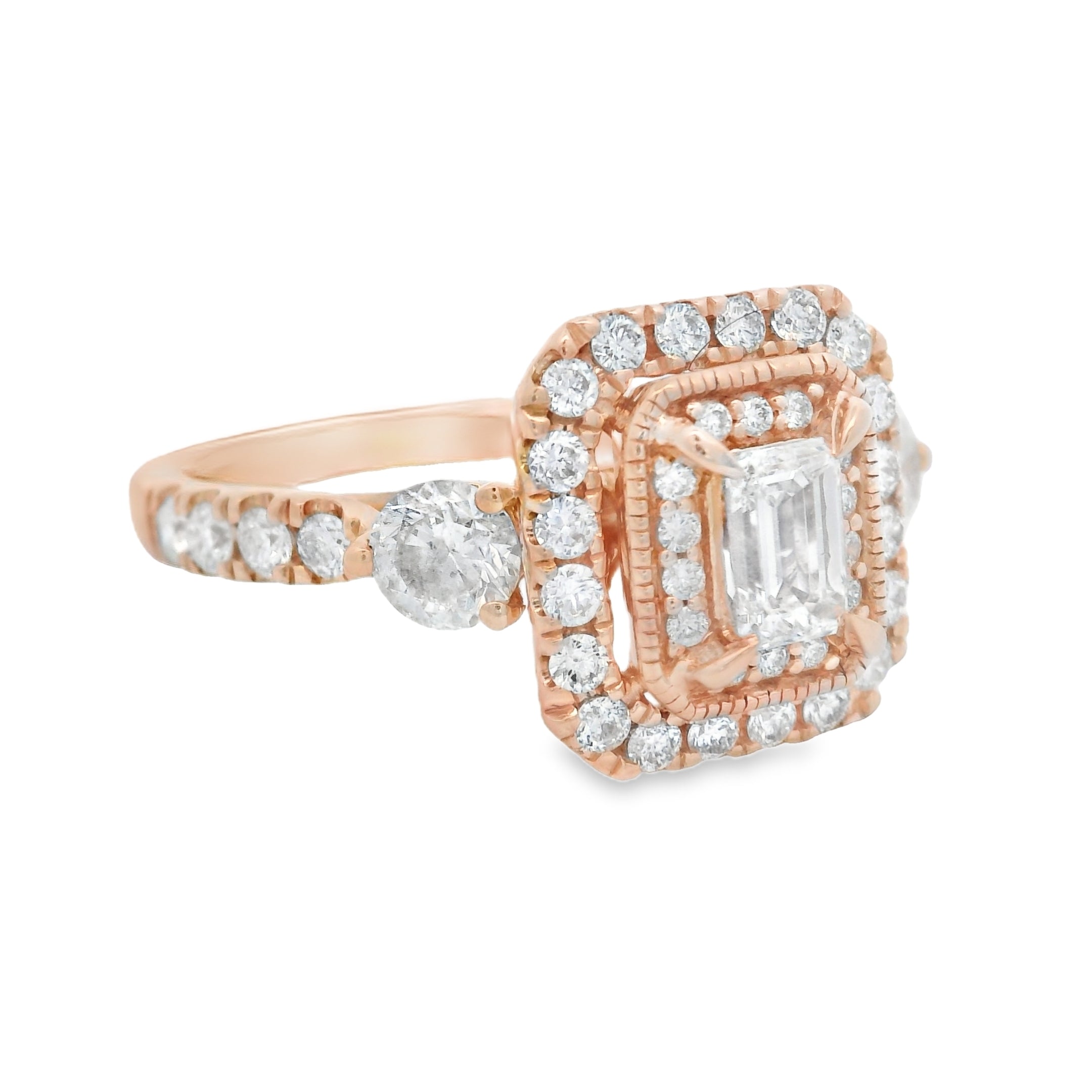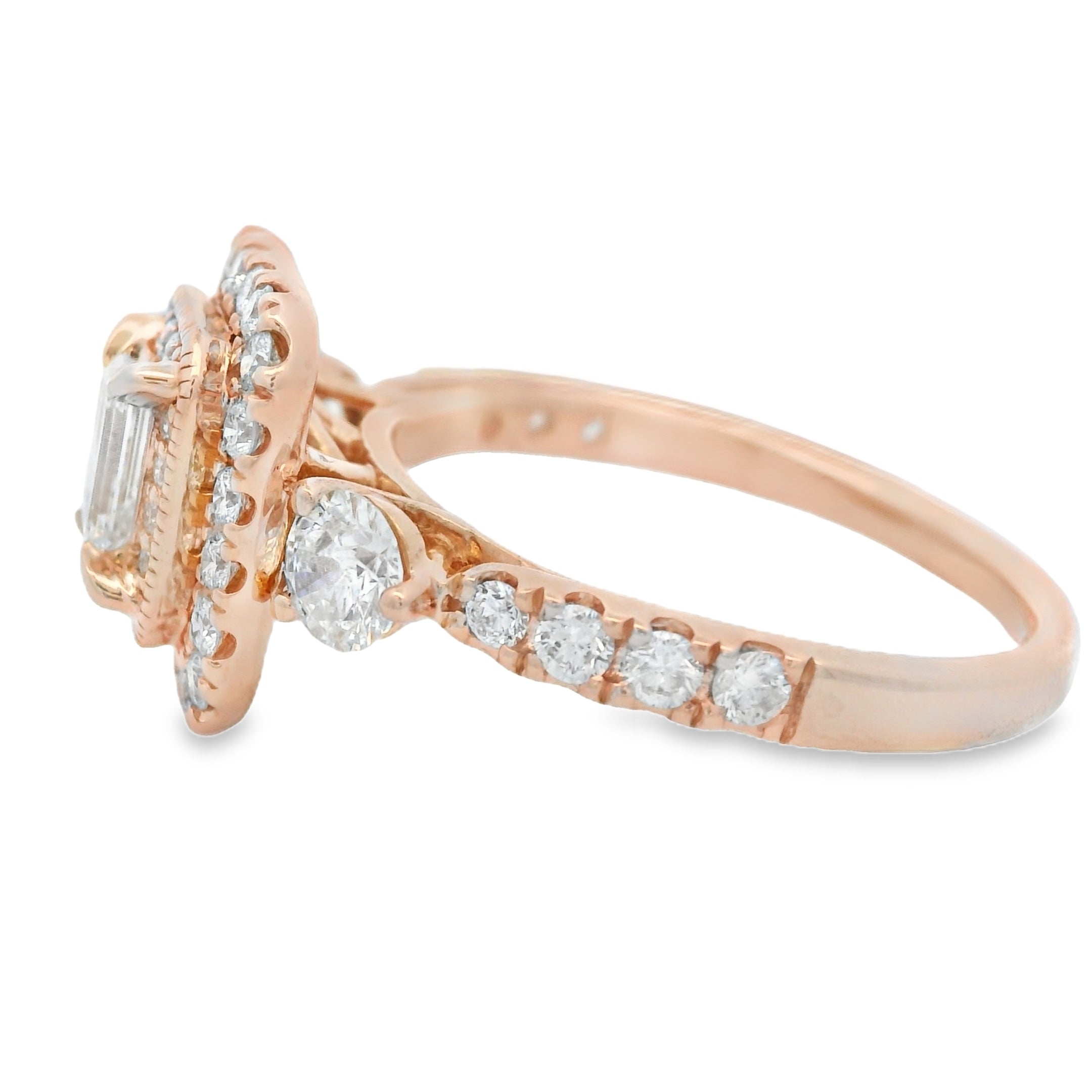 Discover the exquisite beauty of this rose gold diamond ring, featuring a stunning emerald-cut center stone surrounded by a halo of sparkling diamonds. Perfect for engagements or special occasions, this ring combines timeless elegance with modern design.