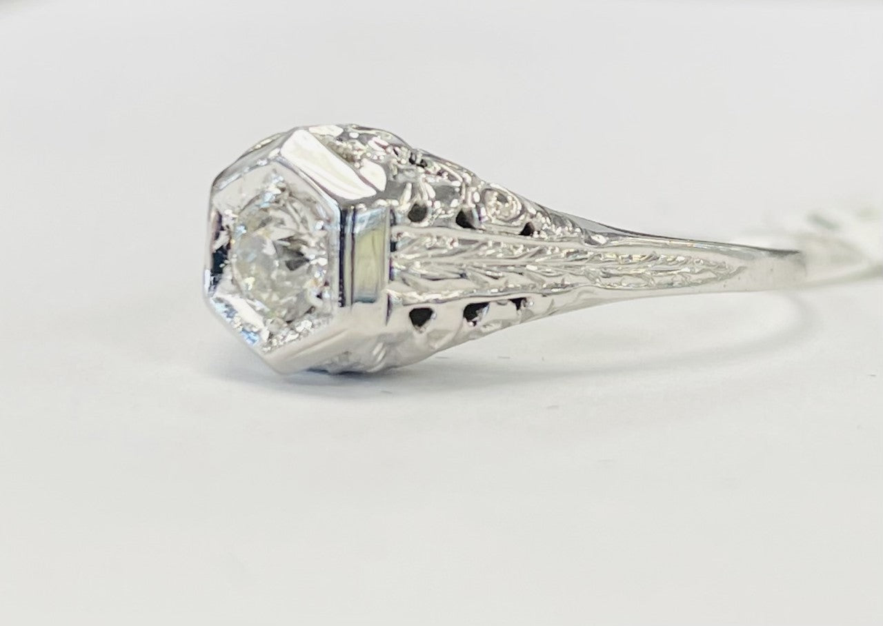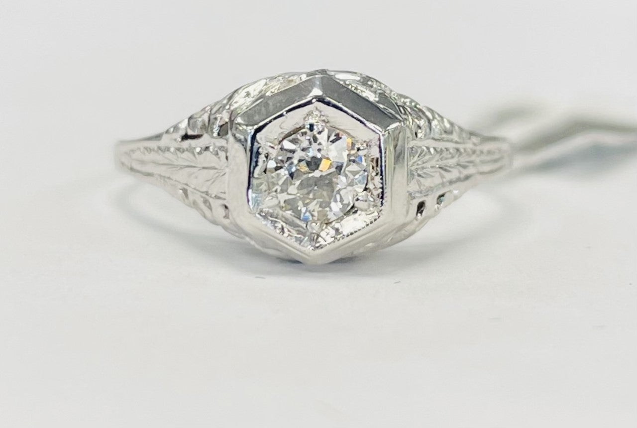 Made out of high purity white gold, this ring accents the center eurpoean cut diamond. Held saftly with 6 prongs and a art deco style setting this diamond is not only elegant but also protected! Featuring so much beautiful filligree this ring is a must have for any vintage lover out there!