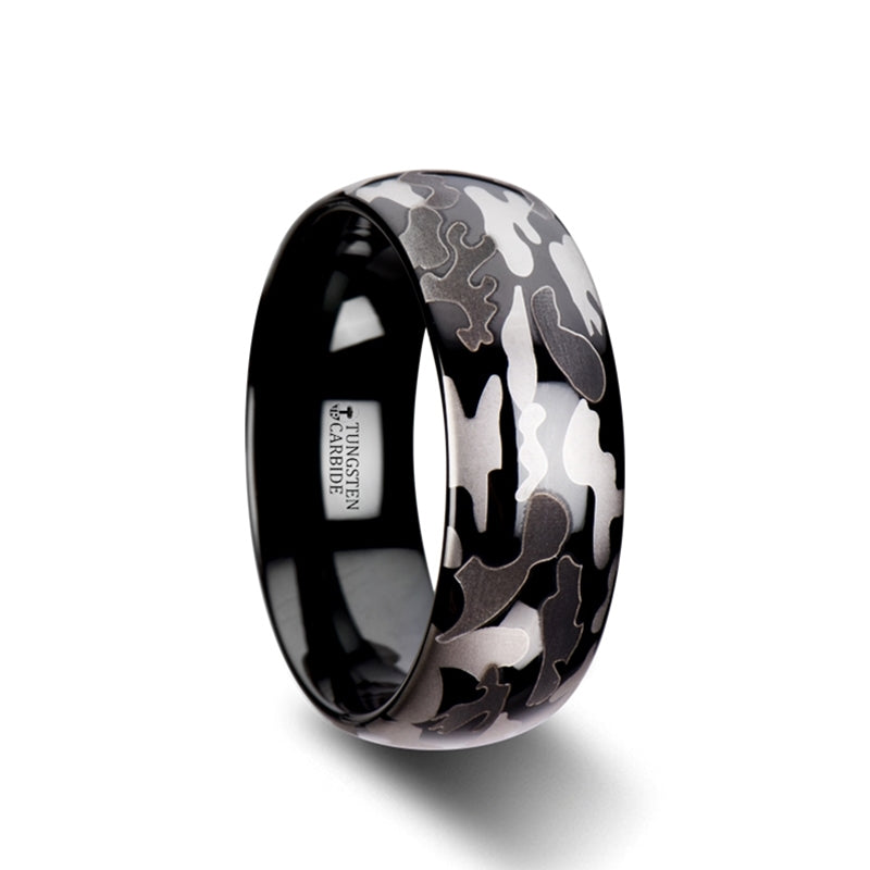 Domed Black Tungsten Carbide Ring with Black and Gray Camo Pattern