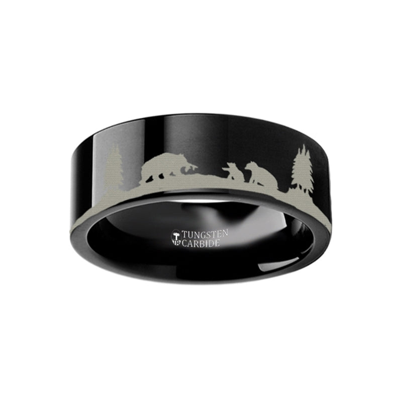 Animal Landscape Scene Bears Bear Cubs Ring Engraved Flat Black Tungsten Ring