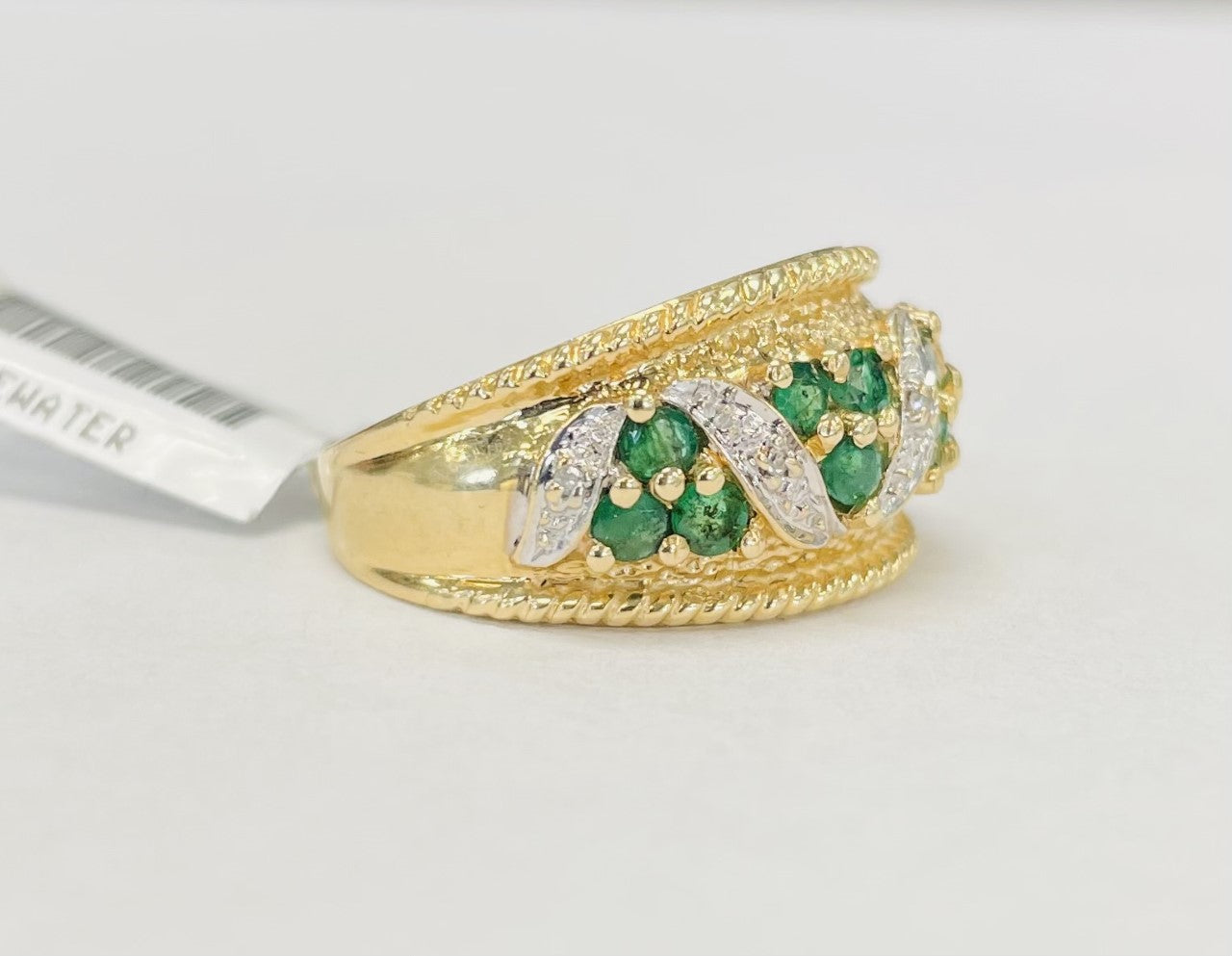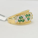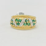 This stunning antique yellow gold ring features natural emeralds and diamonds in a beautiful and flowing pattern. Accented by millgrain and rope accents this ring is a true one of a kind antique.