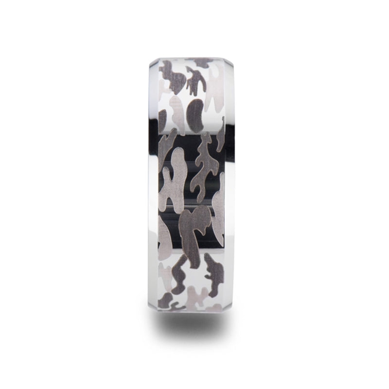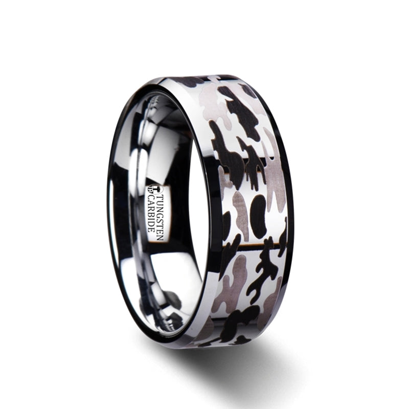 Beveled Tungsten Carbide Ring with Black and Gray Camo Pattern