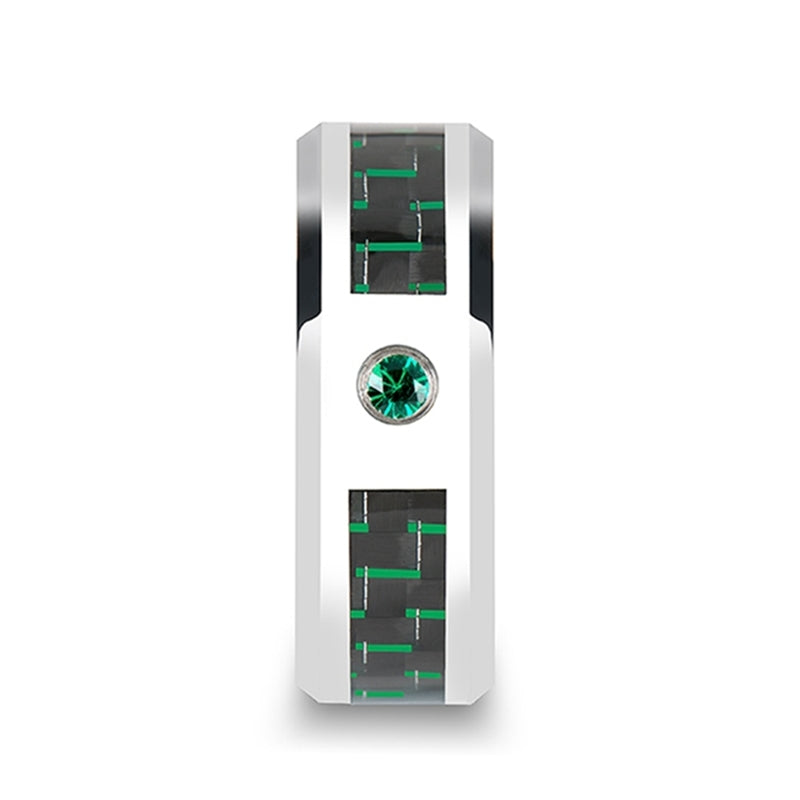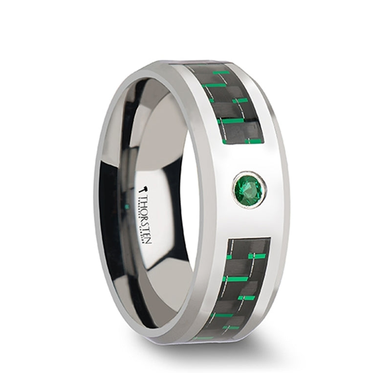 Tungsten Carbide Ring with Black and Green Carbon Fiber and Emerald Setting