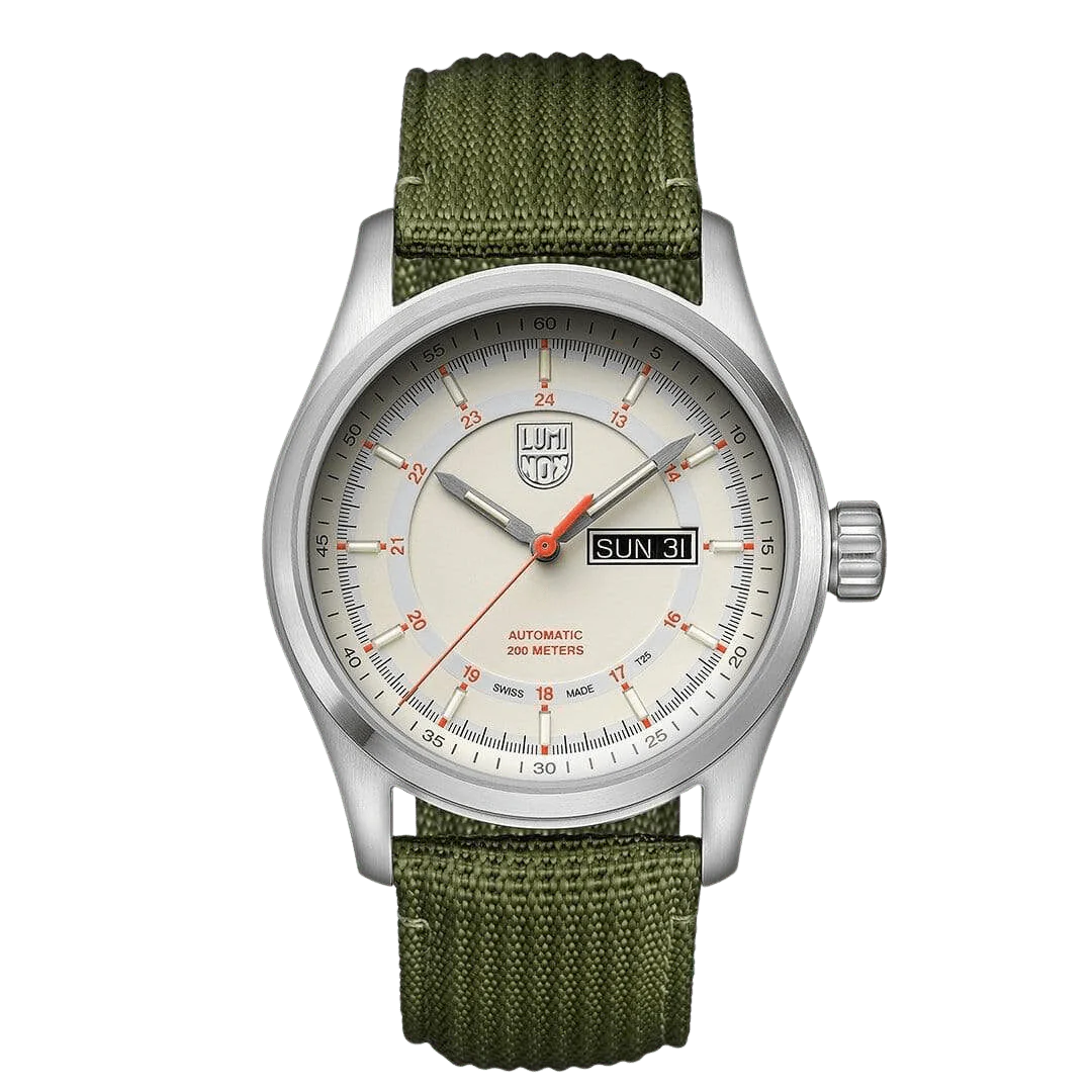 Named after the Atacama Desert in Chile, the driest true desert in the world, this watch combines a great look with the ruggedness Luminox is famous for. A white dial with orange accents is accompanied by an army green durable textile strap. Powered by an automatic swiss-made movement, from the field to the office, this modernized take on a classic style is bound to impress.