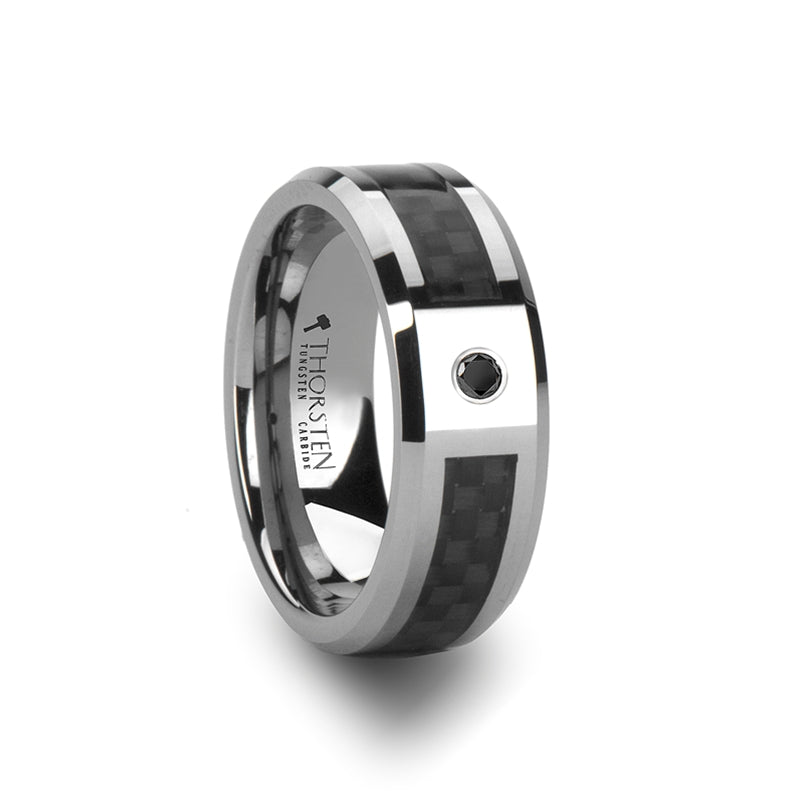 Tungsten Carbide Ring with Black Carbon Fiber and Black Diamond