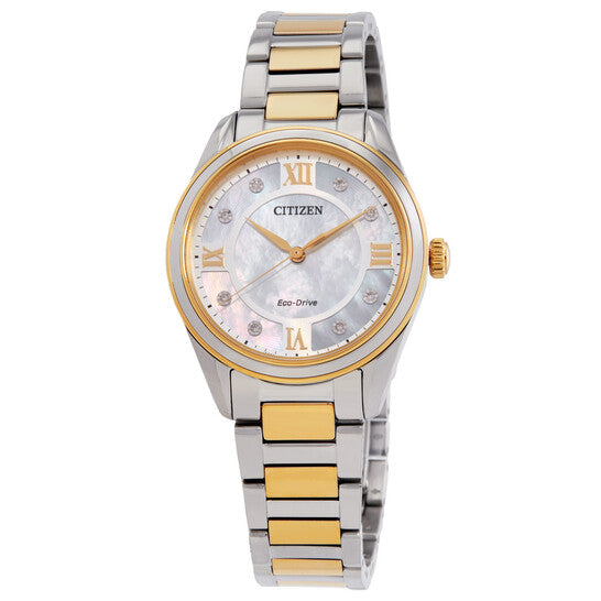 The Citizen EM0874-57D from the Arezzo collection is a refined ladies’ timepiece that blends classic luxury with modern sustainability. Its 32mm two-tone stainless steel case and bracelet are paired with a white mother-of-pearl dial adorned with diamond hour markers and Roman numerals. Powered by Citizen’s Eco-Drive technology, it charges in any light and never needs a battery. With a sapphire crystal and jewelry-style clasp, this watch is perfect for women who appreciate timeless elegance and reliable performance.