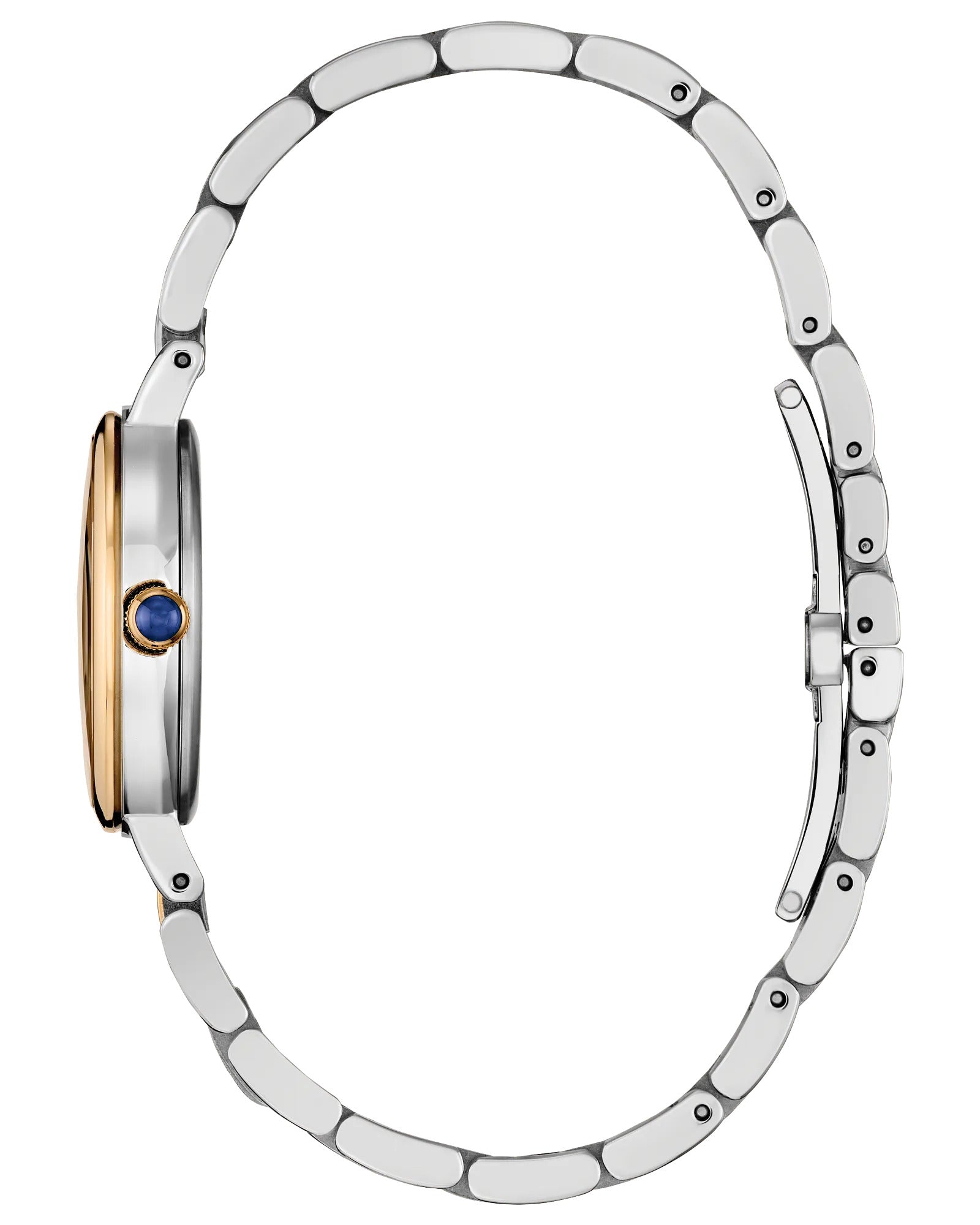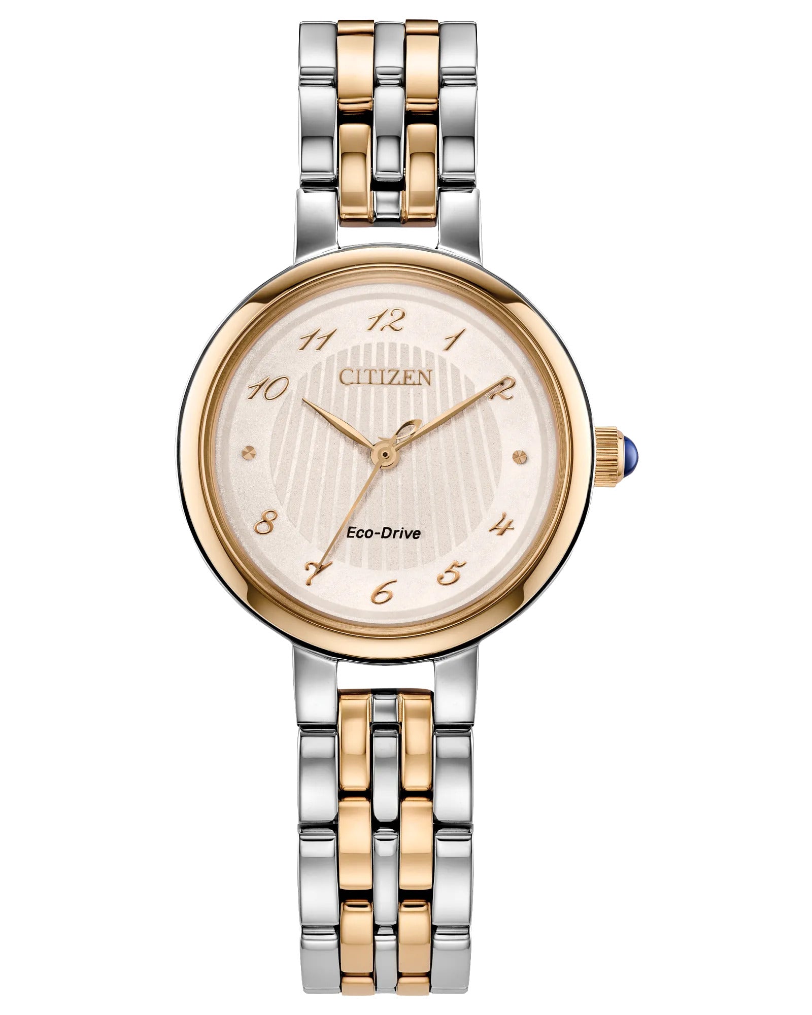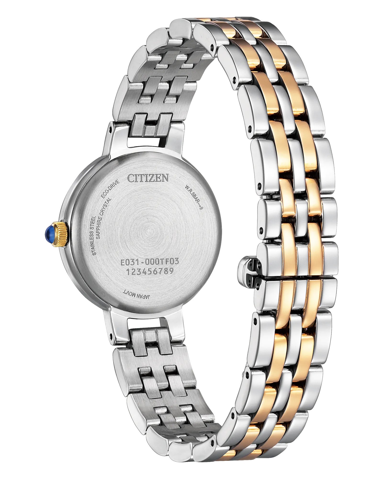 When it comes to elegant watches for women, the Citizen L “Classic” is the perfect addition to a collection. Featuring a two-tone silver- and rose gold-tone stainless steel case measuring 28mm across, its round shape is punctuated by a synthetic sapphire-set crown and flowing five-link bracelet. On the sectored white dial, the mother-of-pearl display features rose gold-tone accents, with the slim lines of the Breguet-style numeral indices matching the leaf-style hands. With this watch, you'll never need to worry about replacing a battery – this watch is sustainably powered by any light with our proprietary Eco-Drive technology. Whether you’re looking for a dress watch for special events or a beautiful timepiece to wear every day, the Citizen L “Classic” will look great on every wrist and at every occasion. Water resistant up to 50 meters. Caliber E031.