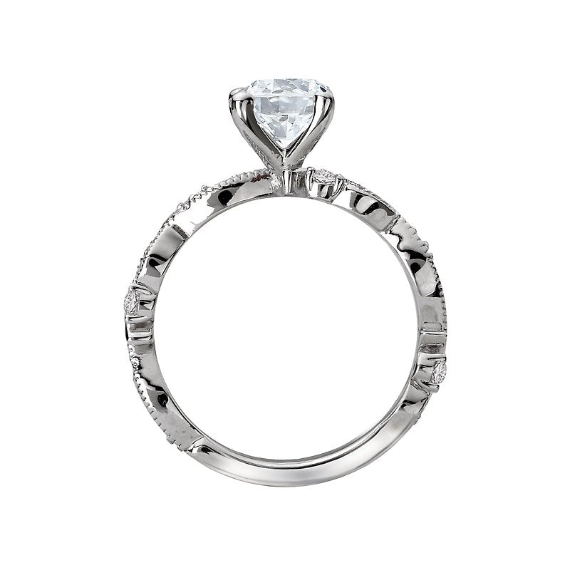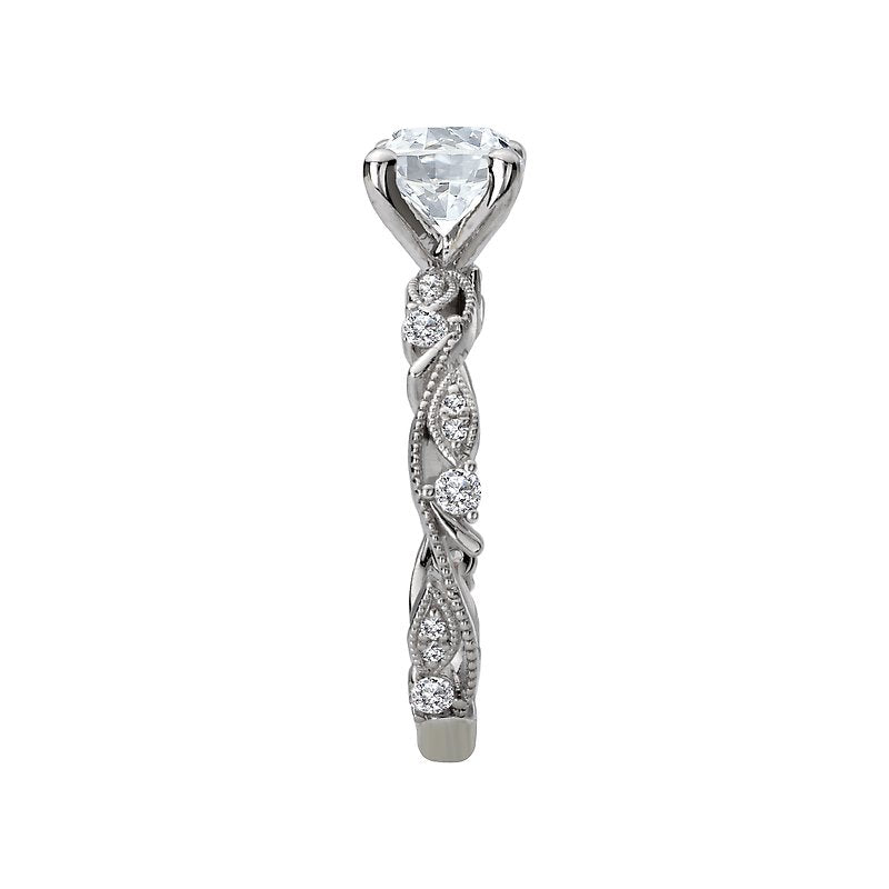 *** Lab Grown Diamond *** Elegant engagement ring features leaf designs and milgrain accents. The sparkling diamonds are set in 14kt high polished white gold. (D 1/5 carat total weight) This SEMI-MOUNT ring comes with NO CENTER STONE but it will accommodate a 6.5mm round center.