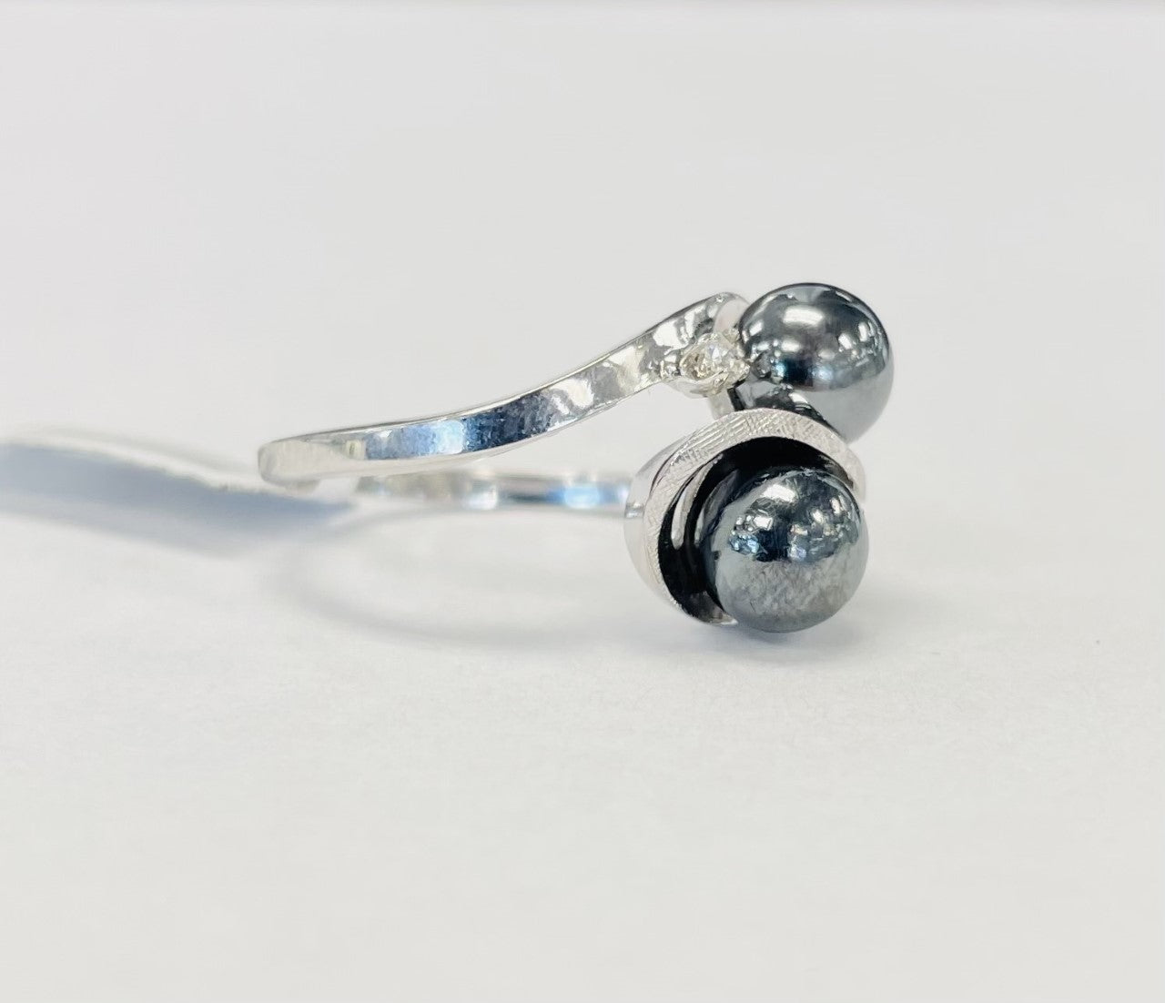This beautiful cocktail ring features a twisted flowing style with two tahitian pearls side by side each. The flowing style is complimented by not only the pearls but by the accented diamond and custom finish to the top of the ring. A truly unique and vintage style that people dream of owning is your for the taking.