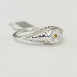 This fasinating ring features detailed filigree all round the sides and undercarriage of the ring. Accented by a single Yellow diamond in the center this ring is not only beautiful but unique as well.