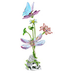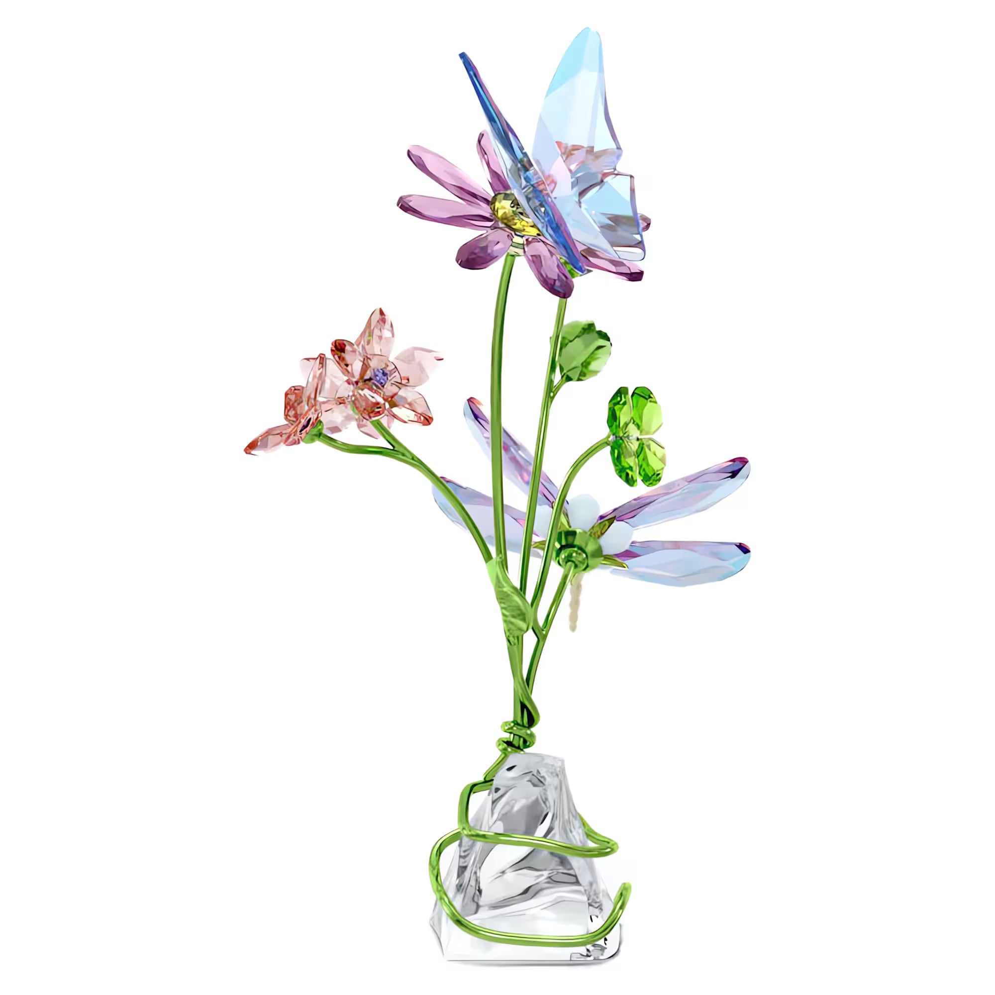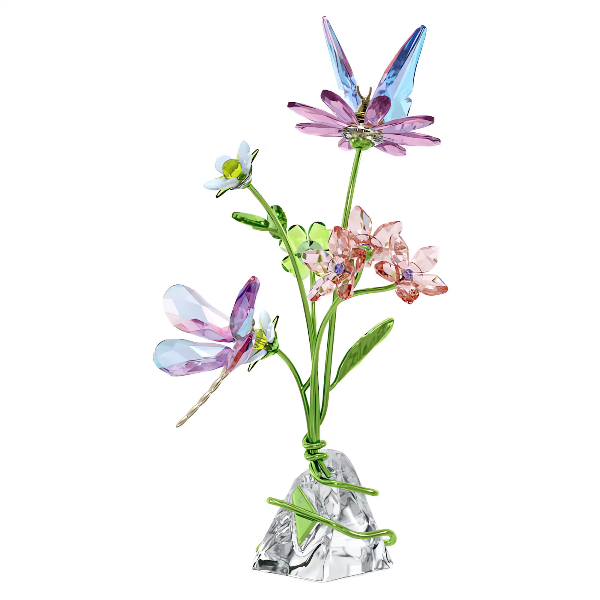 In this idyllic wildflower scene, Swarovski has captured the beauty of nature in exquisite detail. The crystallized creation is produced in a variety of vivid colors, with 1,229 facets that reflect light from every angle. Along with a delicate butterfly and curious dragonfly adorned with precision-cut wings, this joyful piece features lacquered metal accents, forming luminous leaves and stems that gracefully entwine across a natural unfaceted crystal base. An imaginative display that will inject pure wonder into any home décor. No vase or base required. Decoration object. Not a toy. Not suitable for children under 15.