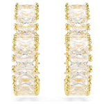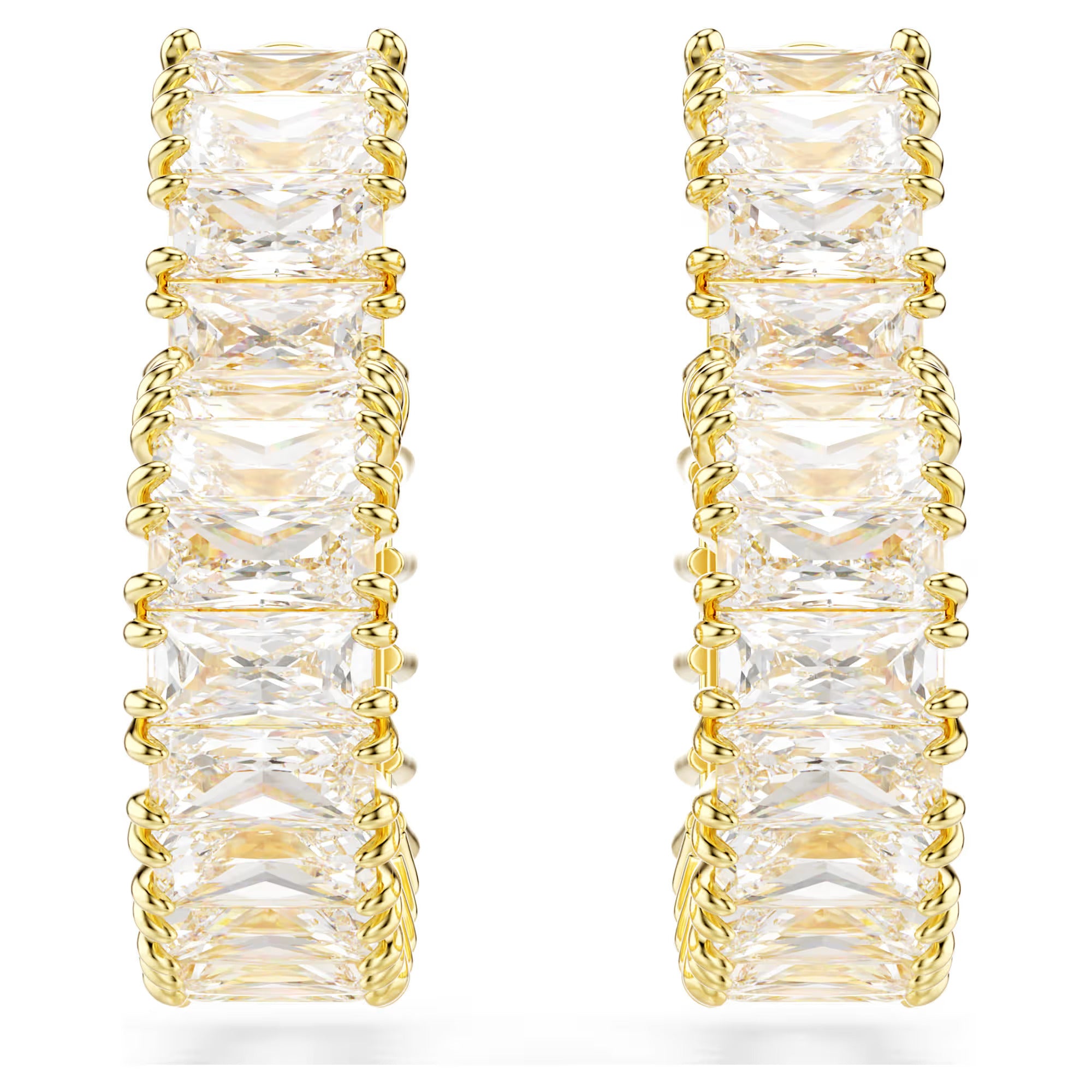 Fall in love with these romantic heart-shaped pierced earrings. The design is gold-tone plated and features a full set of clear baguette-cut Swarovski Zirconia. A modern and brilliant take on a classic hoop.