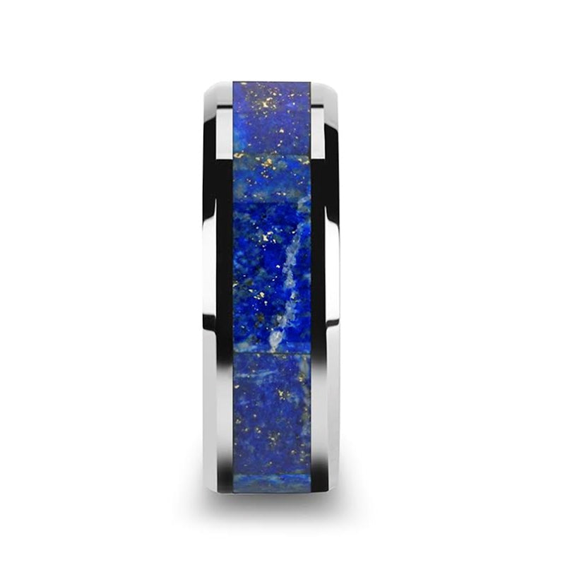Men’s Polished Tungsten Wedding Band with Blue Lapis Inlay & Beveled Edges