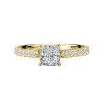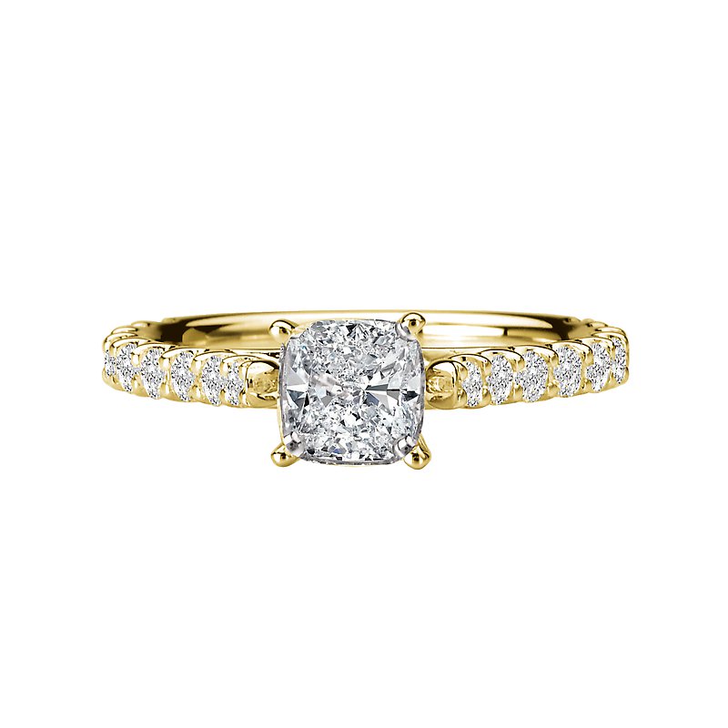 Cathedral Style Diamond Ring in 14kt Yellow Gold with a Peg Head Center. (D. 1/2 carat total weight) This item is a SEMI-MOUNT and it comes with NO CENTER STONE as shown but it will accommodate a 6.5mm round or 5.5 cushion cut center stone. Peg Head
