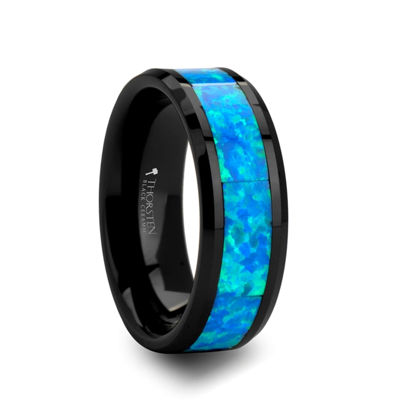 Blue & Green Opal Inlaid Black Ceramic Ring