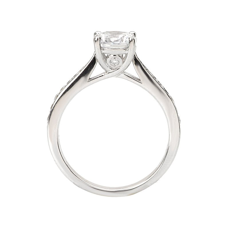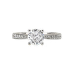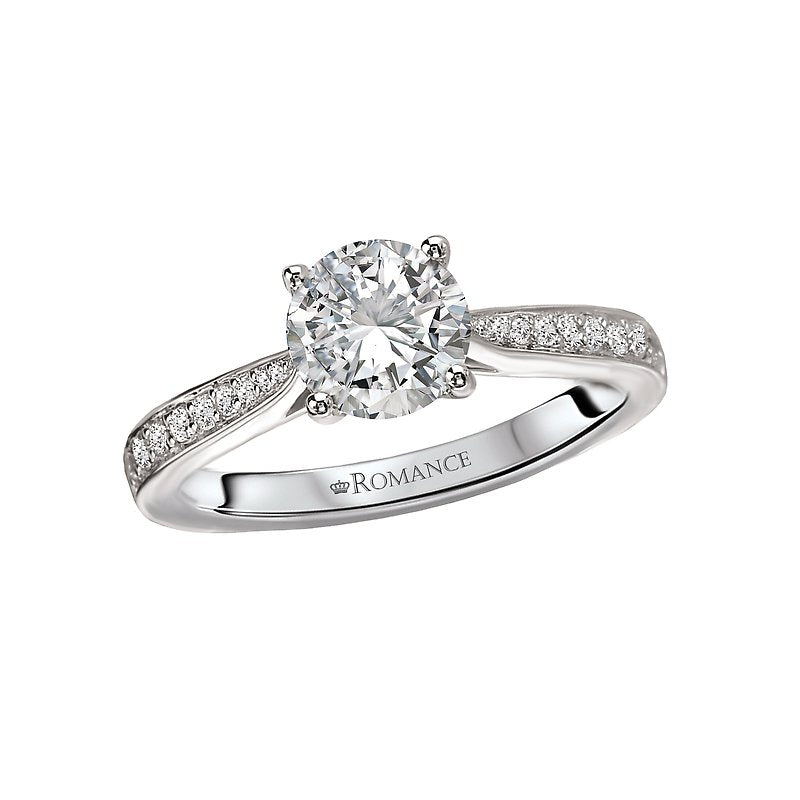 This 18kt white gold semi-mount engagement ring features tapered round diamonds along each side of an interwoven prong center setting that holds a 6.5mm round diamond. Inbetween those prongs sits a single round diamond that sparkles on the side view. (D 1/5 carat total weight)