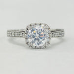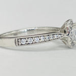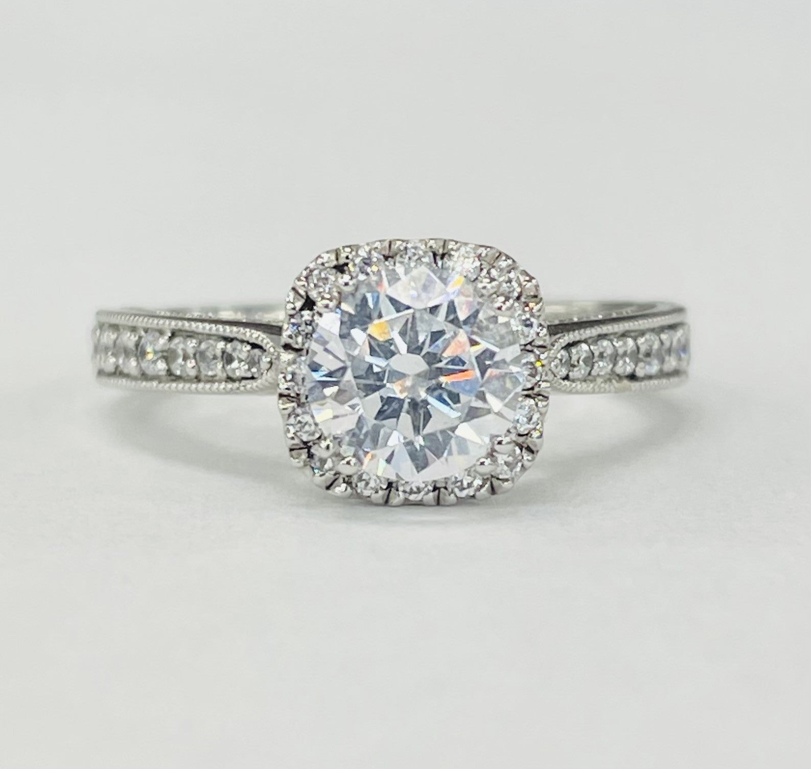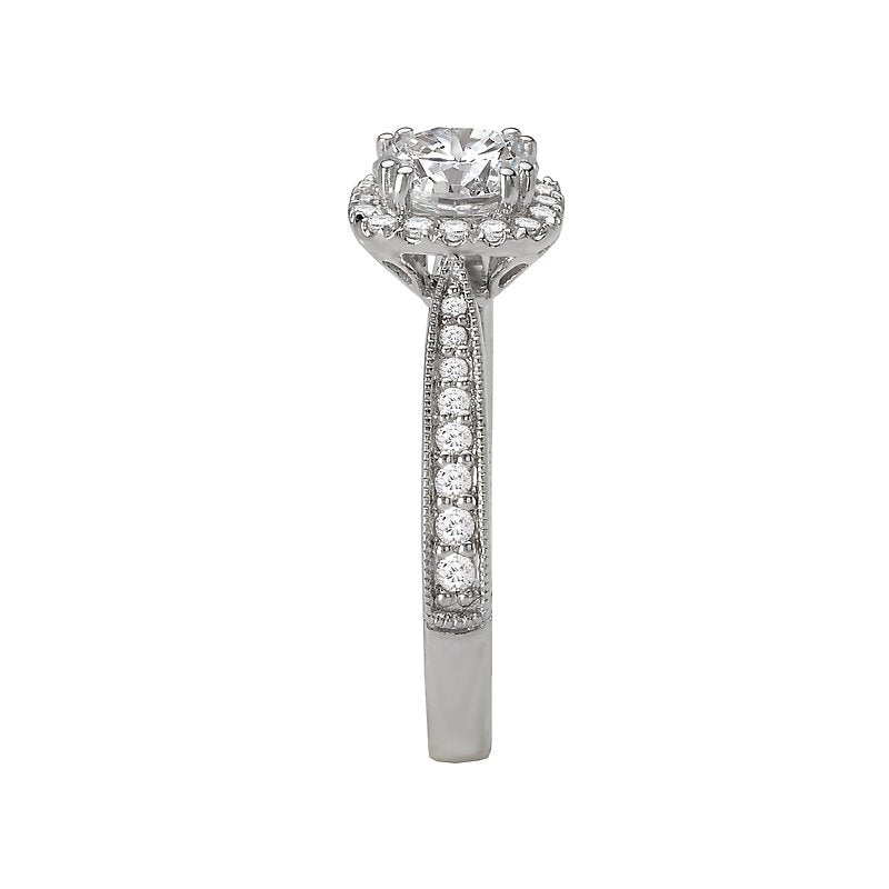 A classic style that has stand the test of time. This beautifu setting is made in vibrant white. Made with accent diamonds down the side and a halo, this ring will shine like no tomorrow.