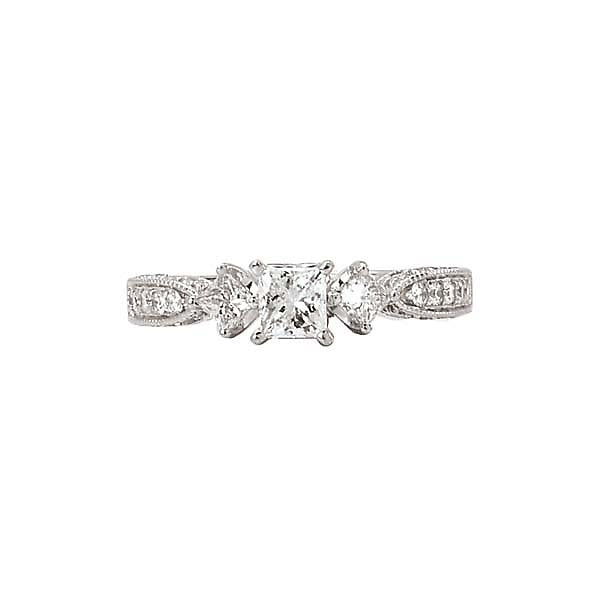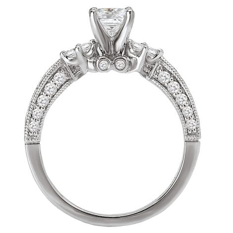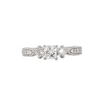 This vintage inspired ring features two diamond set princess cut diamonds on the sides to accent the main center princess cut diamond. With a touch of millgrain around the pave set diamonds on the side and peak-a-boo diamonds under the head this ring will wow any jewelry lover.