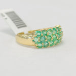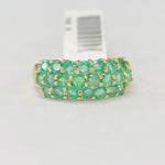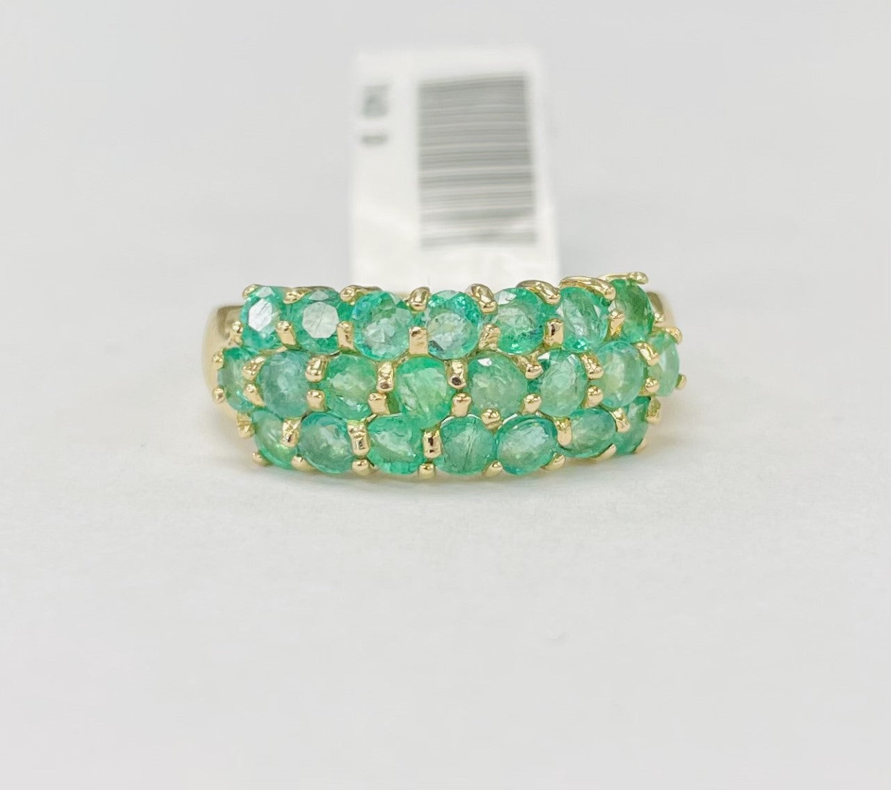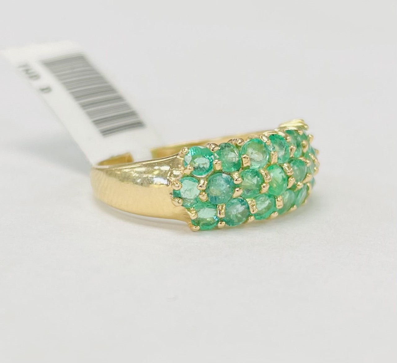 This yellow gold vintage ring features a healthy ammounr of round cut natural emeralds. Making three rows of emeralds to stand out and made out of yellow gold to contrast the green this ring is meant to be worn.