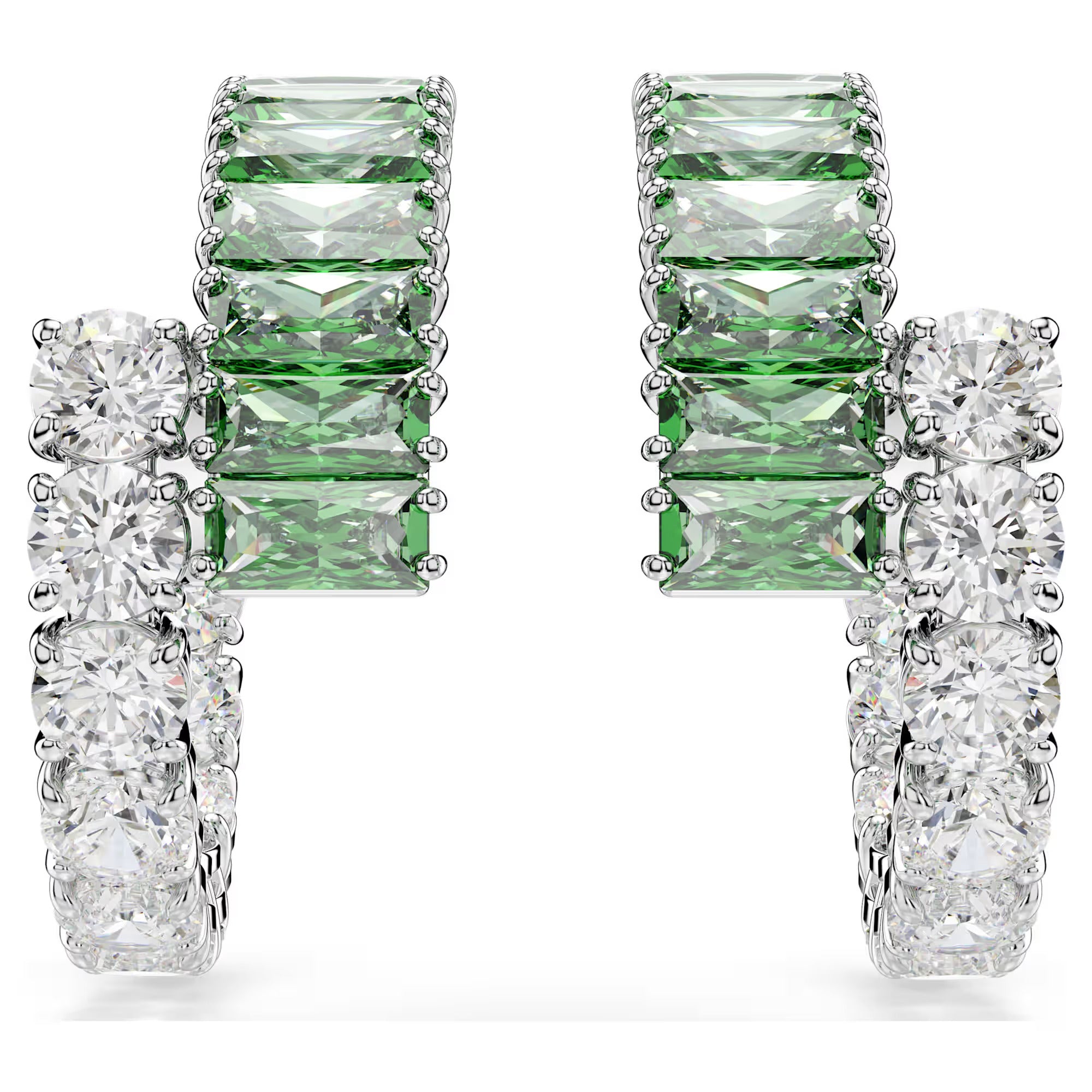 These luxurious Matrix earrings were crafted for a vivid glow. Each small hoop is rhodium plated and features an overlapping design set with clear and green Swarovski Zirconia in round and baguette cuts. A joyful choice for day-to-night styling, these earrings can be paired with a matching ring or bangle to accentuate the color in your style.