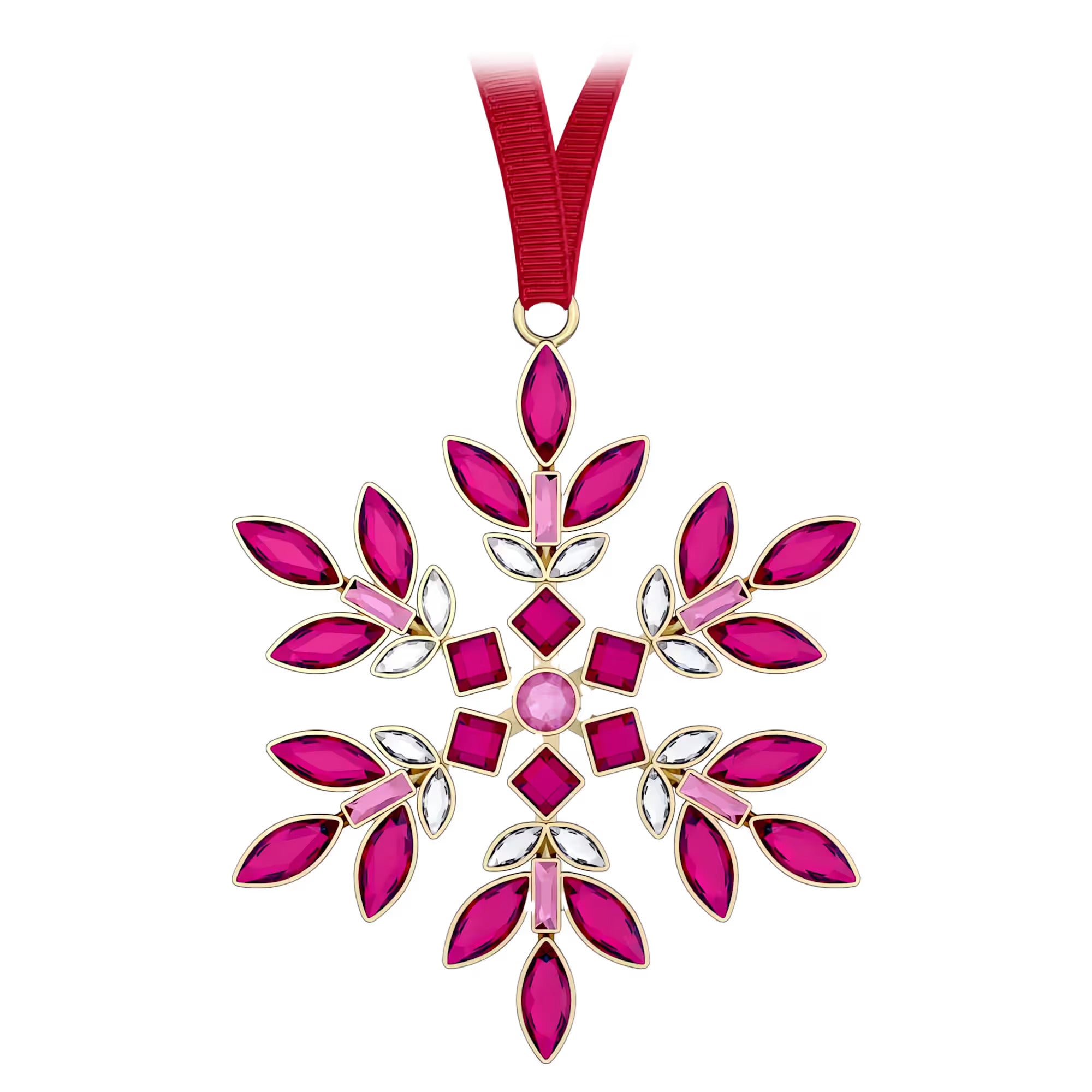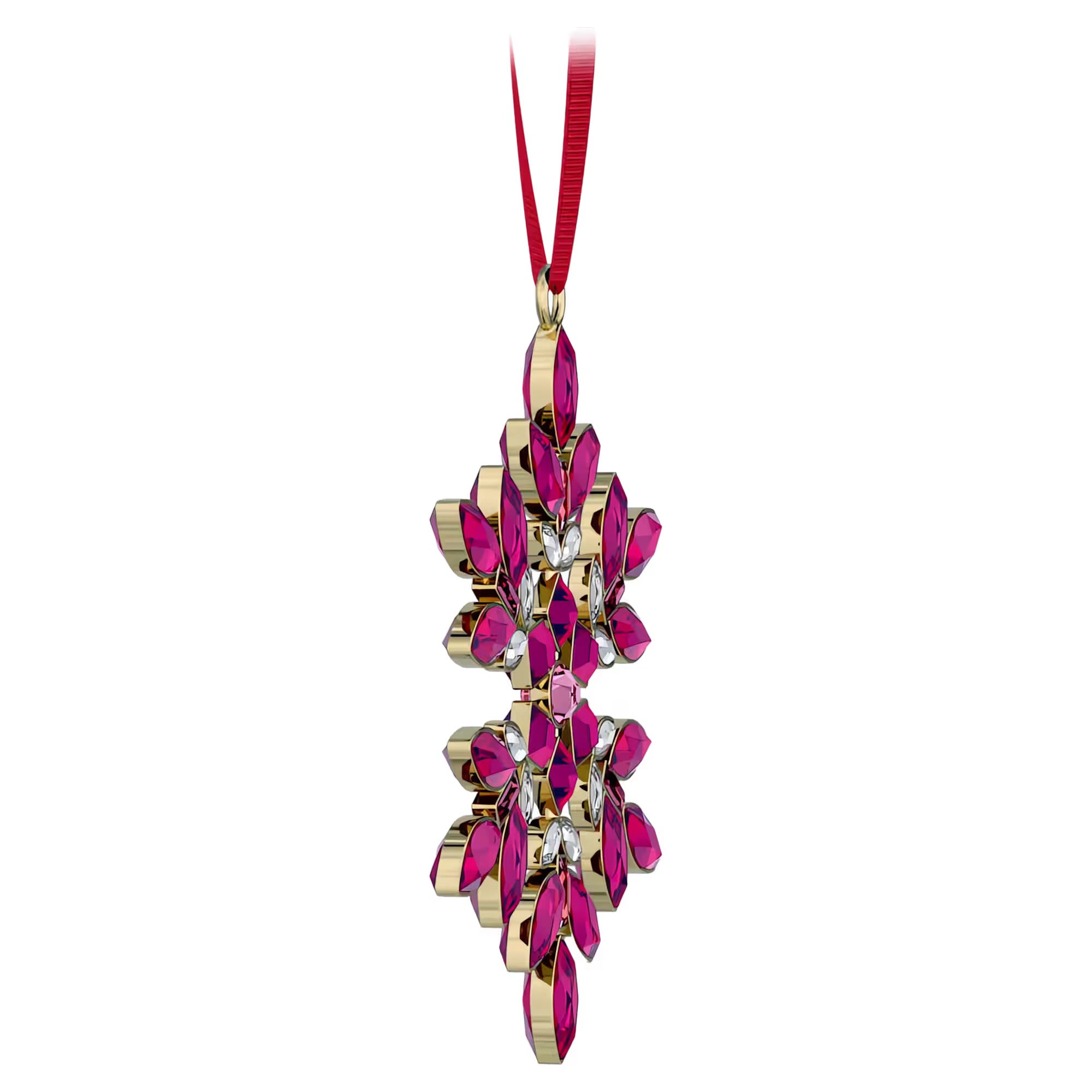 Inspired by the vibrant Gema family, this collection of radiant snowflake ornaments is presented in Swarovski brand colors with a nod to the holiday season. This red piece is formed from 86 individual crystals in a variety of cuts and shades, applied on both sides using jewelry stone setting techniques. The design is suspended from a red grosgrain ribbon and is completed with a glossy gold-tone finish. Collect all four of the Gema snowflake ornaments to create a joyful multicolored display in your home. Decoration object. Not a toy. Not suitable for children under 15.