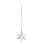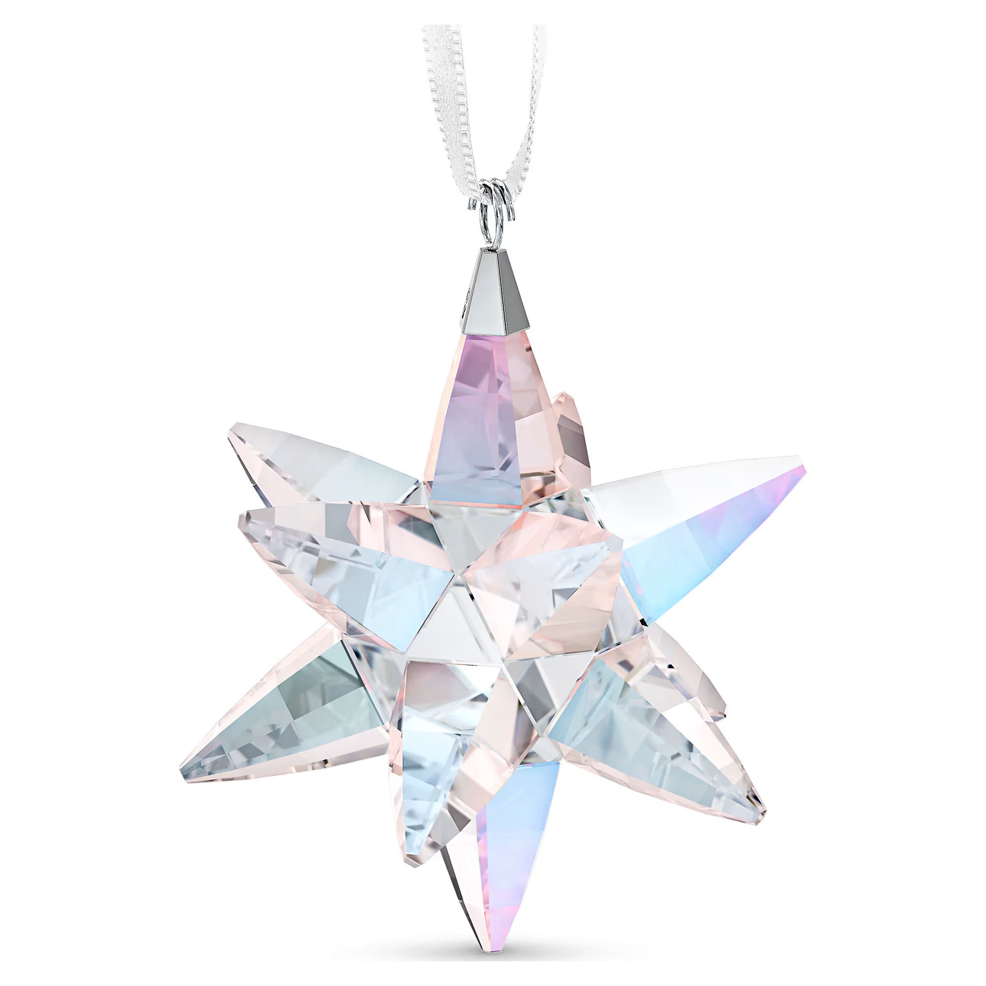 This shimmering Swarovski star is sure to light up your home. Created in 307 sparkling facets, the three-dimensional star refracts the light from all around in scintillating hues. The clear crystal impresses with its special shimmer effect, gleaming with extra brilliance. Hanging on a white satin ribbon, it is a festive addition for a decorative set. A perfect ornament or a radiant gift for festive occasions. Decoration object. Not a toy. Not suitable for children under 15.