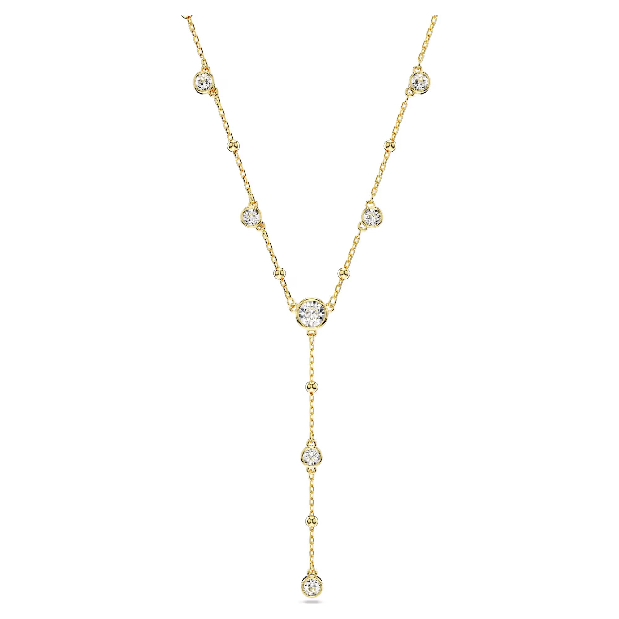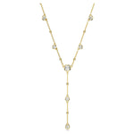 With its distinctive shape, this Imber necklace makes a perfect addition to your jewelry. The design features a gold-tone plated chain, accented with an array of shiny metal droplets and dazzling round-cut crystals in a puffy bezel setting. A delicate strand drops elegantly in the middle, while a single Swarovski Zirconia is placed in the elongation for added luxury. Pair this piece with some Imber earrings for an eye-catching style match.