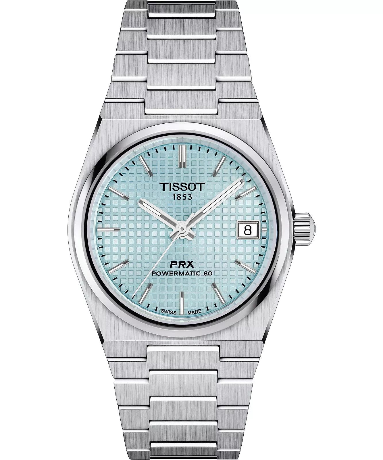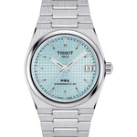 Tissot PRX 35mm Powermatic 80, where timeless aesthetics meet contemporary technology. This 35mm watch exhibits a high-quality steel case and a vibrant ice blue dial. This trendy shade casts an exquisite hue, perfectly catching and reflecting light. The distinctive waffle dial pattern adds a unique sophistication to this automatic model. Equipped with water resistance up to 100 meters and a Nivachron™ balance hairspring, the PRX ice blue becomes an alluring choice for the style-conscious and practical watch enthusiast. The satin-finish steel bracelet, complete with a triple-blade folding steel clasp, ensures an impeccable fit. Showcase your taste with the Tissot PRX 35mm Powermatic 80 in ice blue.