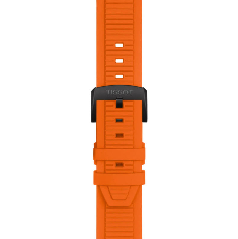 Tissot watch with black dial and orange strap on a white background