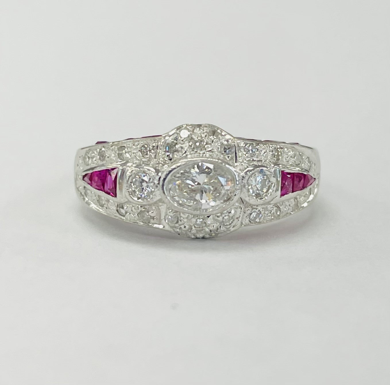 White Gold Custom Cut Rubies And Diamond Estate Ring