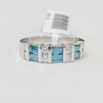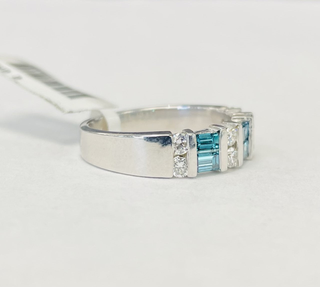 This elegant yet sturdy ring shows off what true luxury feels like. Featuing beautiful round brilliant white diamonds and contrasted by the stunning hue of the blue baghuette diamonds this ring just feels and looks like royalty.