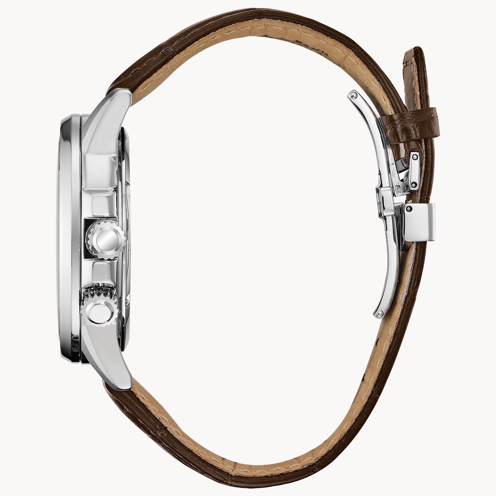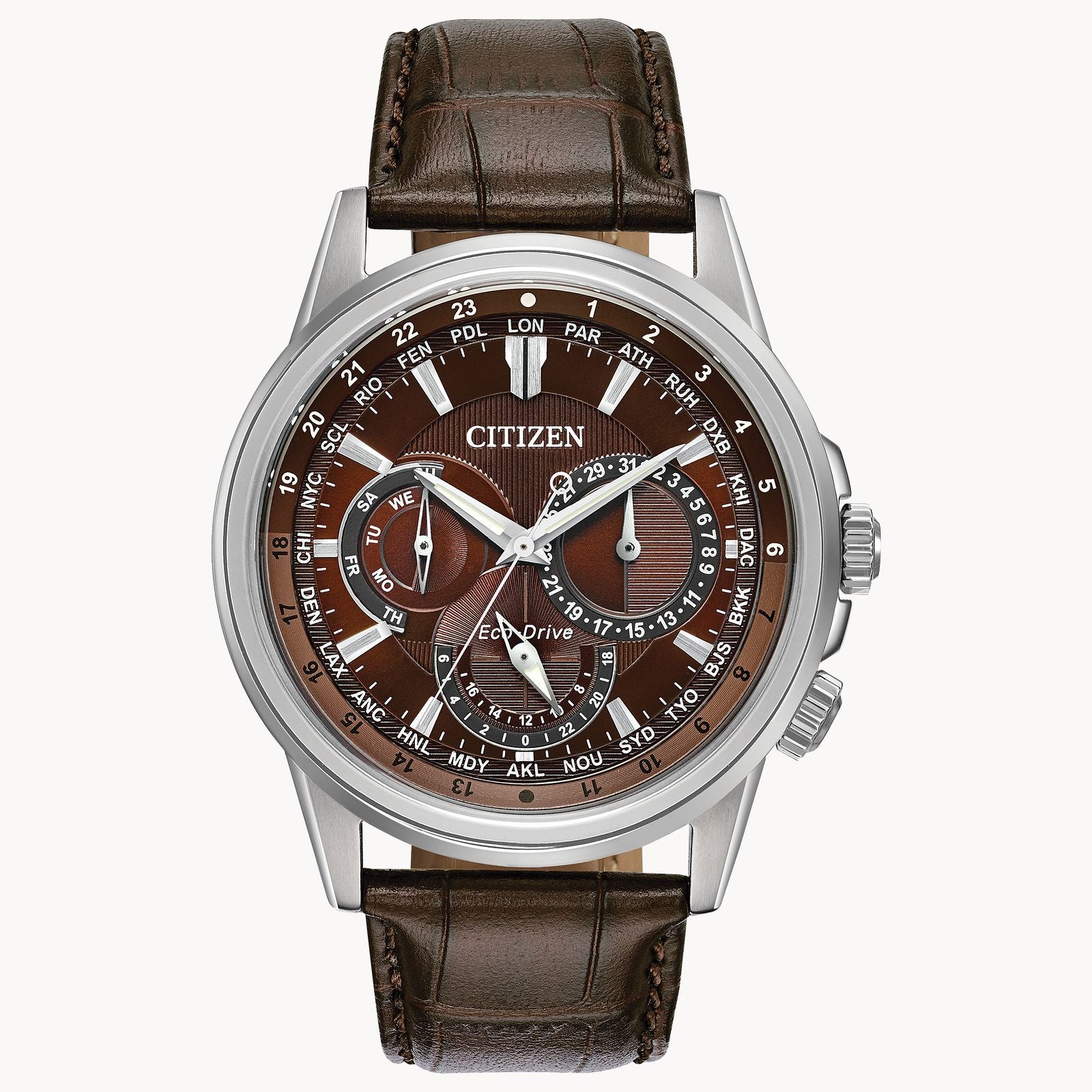 Bring sophistication to your day with the CITIZEN® Calendrier, powered by any light with Eco-Drive. This timeless watch features 12/24-hour time, world time in 24 cities and day/date. Men's watch featured with stainless steel case, chocolate brown leather strap with matching brown dial. Featuring our Eco-Drive technology – powered by light, any light. Never needs a battery. Caliber number 8729.