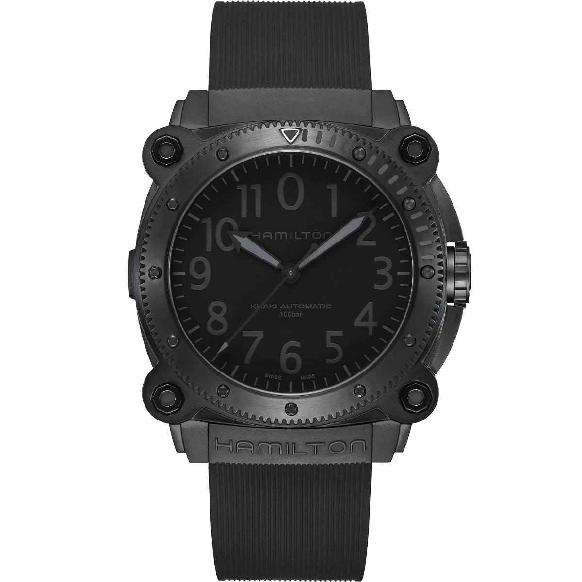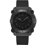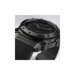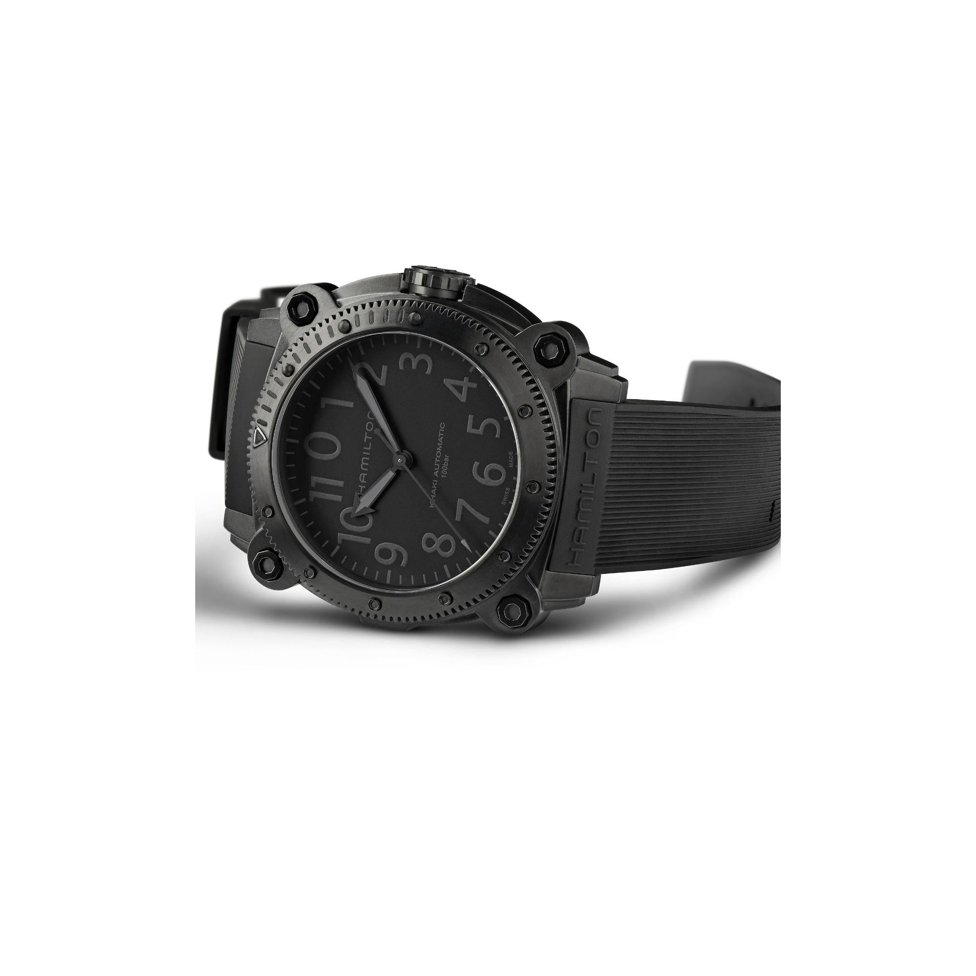 A new titanium case adds lightweight durability to the high performing Khaki Navy BeLOWZERO. Water resistant to 100 bar (1,000 m) and equipped with a helium escape valve, this submarine-inspired watch is perfect for your next water adventure. The impressive 46mm titanium case treated with black PVD is the epitome of stealth style and features a special diving mask embossed on the case back.
