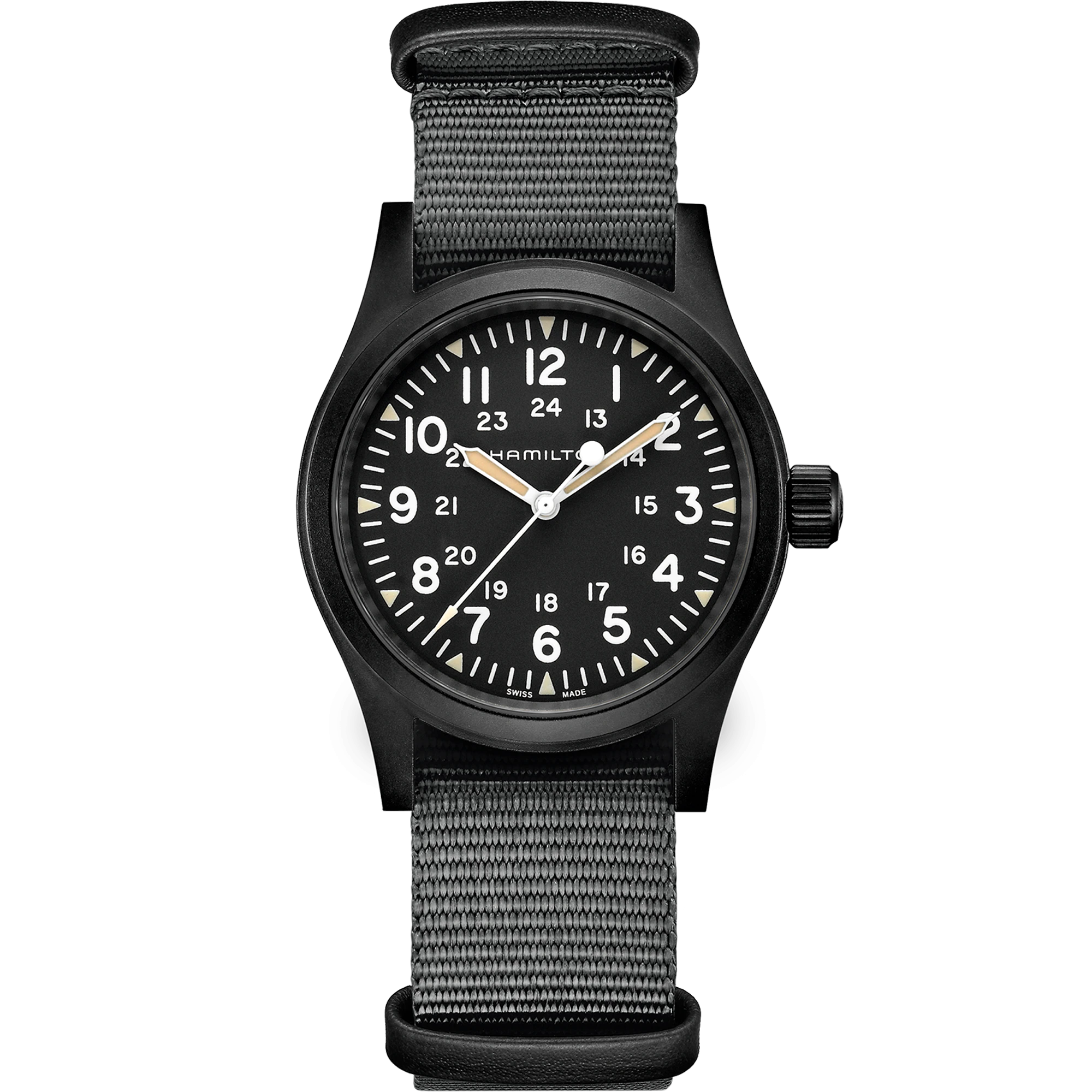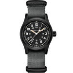 The black and gray color scheme of this Khaki Field Mechanical is a subtle approach to military styling. It is powered by the exclusive H-50 handwinding movement which is housed in a 38 mm case. Triangular indexes with old radium color Super-LumiNova® and a durable NATO strap complete the package.