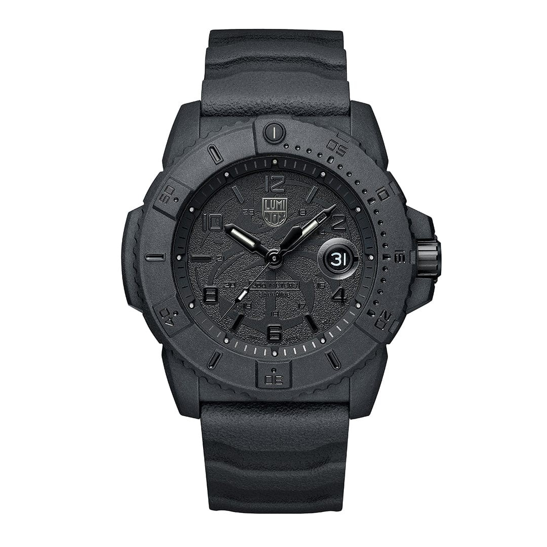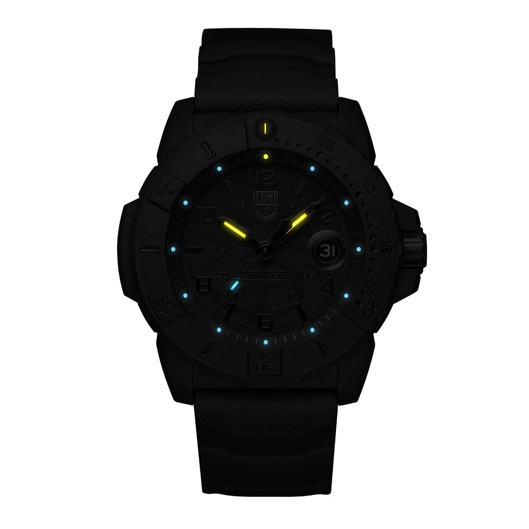This complete black-out Navy SEAL Foundation watch contrasts the Luminox Light Technology in yellow and ice blue and symbolizes the light the Foundation shines on veterans and their families. This striking design features the signature Navy SEAL Foundation logo across the full face of the dial and case back. With sapphire crystal and a 45mm CARBONOX™ case, bezel and clasp, this timepiece was created for intense durability and is water resistant up to 200 meters.