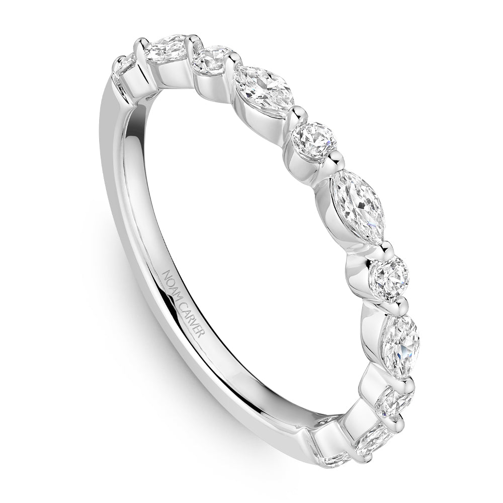 The Noam Carver Stackables Collection is designed for versatility and elegance. The STC46-1WM-D SZ7 wedding band features an alternating pattern of marquise and round brilliant diamonds set in luminous 14K white gold. With its refined sparkle and timeless craftsmanship, this band is perfect for stacking with engagement rings or wearing solo as a statement piece. Its delicate yet durable design makes it ideal for brides seeking a modern yet classic wedding band.